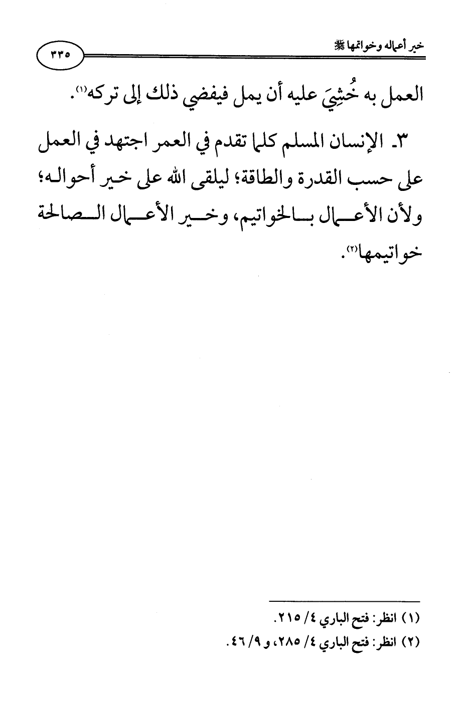 3 - الإنسان المسلم كلما تقدم في العمر اجتهد في العمل على حسب القدرة والطاقة؛ ليلقى الله على خير أحواله؛ ولأن الأعمال بالخواتيم، وخير الأعمال الصالحة خواتيمها (¬2).