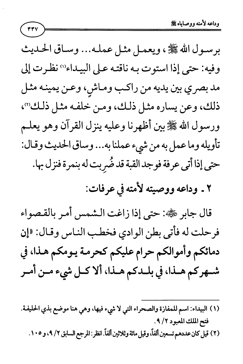 2 - وداعه ووصيته لأمته في عرفات: قال جابر رضي الله عنه: «حتى إذا زاغت الشمس أمر بالقصواء فرحلت له فأتى بطن الوادي فخطب الناس وقال: "إن دمائكم وأموالكم حرام عليكم كحرمة يومكم هذا، في شهركم هذا، في بلدكم هذا، ألا كل شيء من أمر