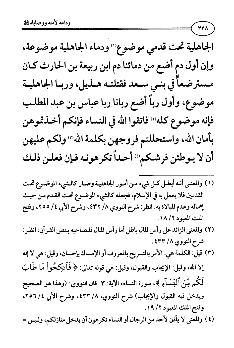 الجاهلية تحت قدمي موضوع (¬1) ودماء الجاهلية موضوعة، وإن أول دمٍ أضع من دمائنا دم ابن ربيعة بن الحارث كان مسترضعًا في بني سعد فقتلته هذيل، وربا الجاهلية موضوع، وأول ربًا أضع ربانا ربا عباس بن عبد المطلب فإنه موضوع كله (¬2) فاتقوا الله في النساء فإنكم أخذتموهن بأمان الله، واستحللتم فروجهن بكلمة الله (¬3) ولكم عليهن أن لا يوطئن فرشكم (¬4) أحدًا تكرهونه فإن فعلن ذلك