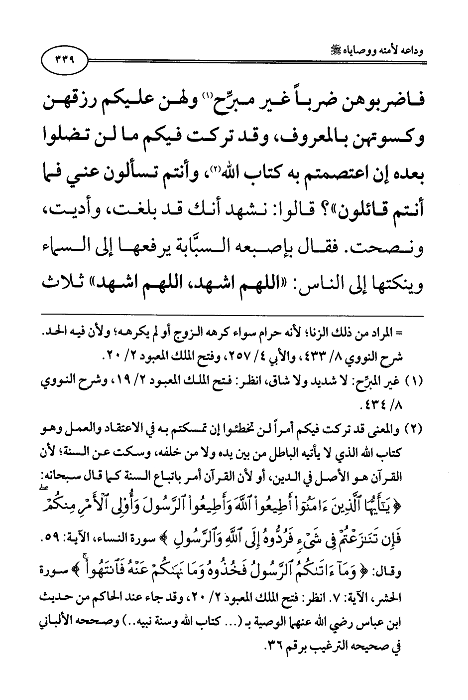 ولهن عليكم رزقهن وكسوتهن بالمعروف، وقد تركت فيكم ما لن تضلوا بعده إن اعتصمتم به كتاب الله (¬2) وأنتم تسألون عني فما أنتم قائلون"؟ قالوا: نشهد أنك قد بلغت، وأديت، ونصحت. فقال بإصبعه السبَّابة يرفعها إلى السماء وينكتها إلى الناس: "اللهم اشهد، اللهم اشهد" ثلاث مرات» (¬3).