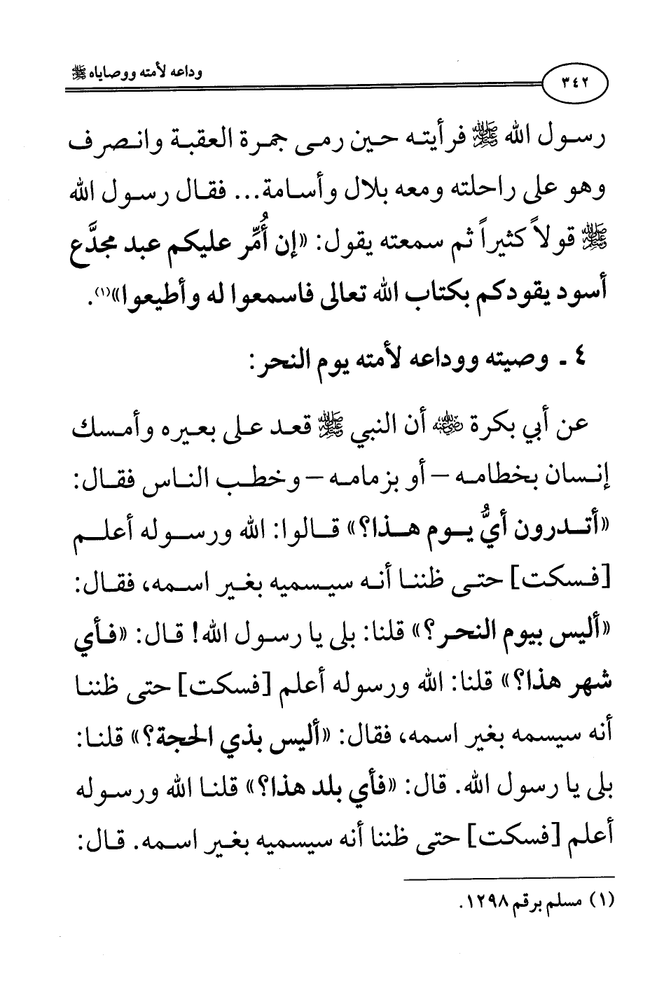 4 - وصيته ووداعه لأمته يوم النحر: عن أبي بكرة رضي الله عنه «أن النبي صلى الله عليه وسلم قعد على بعيره وأمسك إنسان بخطامه - أو بزمامه - وخطب الناس فقال: "أتدرون أيُّ يوم هذا؟ " قالوا: الله ورسوله أعلم [فسكت] حتى ظننا أنه سيسميه بغير اسمه، فقال: "أليس بيوم النحر؟ " قلنا: بلى يا رسول الله! قال: "فأي شهر هذا؟ " قلنا: الله ورسوله أعلم [فسكت] حتى ظننا أنه سيسمه بغير اسمه، فقال: "أليس بذي الحجة؟ " قلنا: بلى يا رسول الله. قال: "فأي بلد هذا؟ " قلنا الله ورسوله أعلم [فسكت] حتى ظننا أنه سيسميه بغير اسمه. قال: