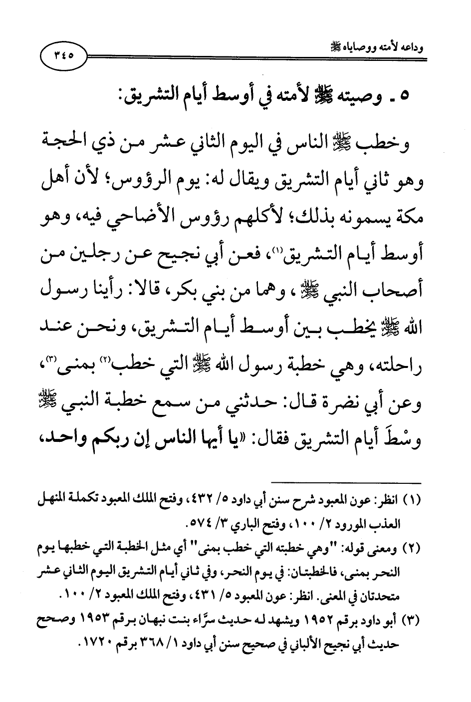 5 - وصيته صلى الله عليه وسلم لأمته في أوسط أيام التشريق: وخطب صلى الله عليه وسلم الناس في اليوم الثاني عشر من ذي الحجة وهو ثاني أيام التشريق ويقال له: يوم الرؤوس؛ لأن أهل مكة يسمونه بذلك؛ لأكلهم رؤوس الأضاحي فيه، وهو أوسط أيام التشريق (¬1) فعن أبي نجيح عن رجلين من أصحاب النبي صلى الله عليه وسلم، وهما من بني بكر، قالا: «رأينا رسول الله صلى الله عليه وسلم يخطب بين أوسط أيام التشريق، ونحن عند راحلته، وهي خطبة رسول الله صلى الله عليه وسلم التي خطب (¬2) بمنى» (¬3) وعن أبي نضرة قال: حدثني من سمع خطبة النبي صلى الله عليه وسلم وسْطَ أيام التشريق فقال: «يا أيها الناس إن ربكم واحد،