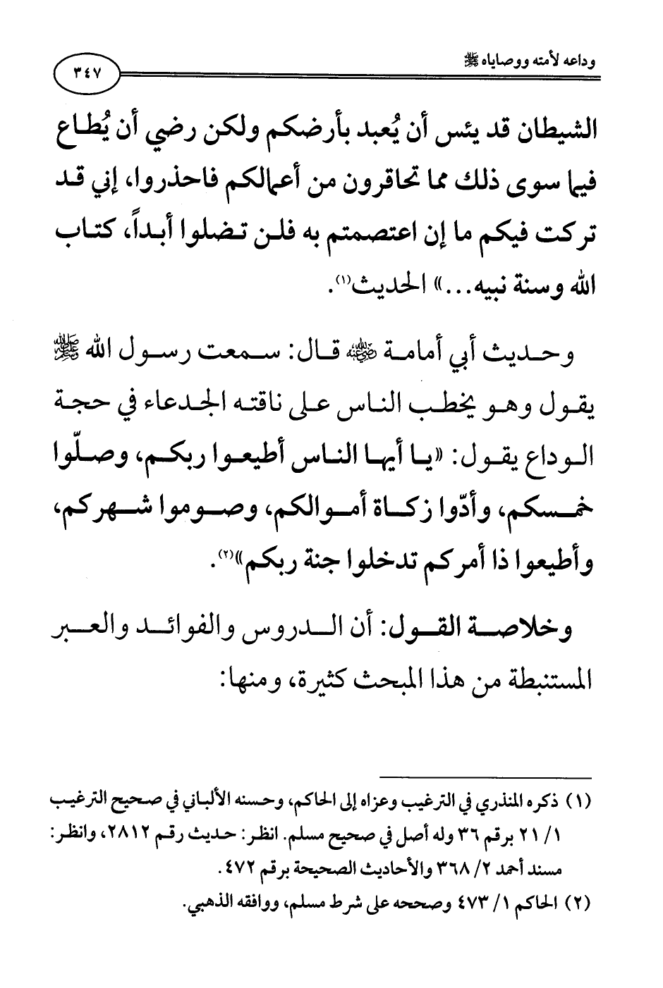 الشيطان قد يئس أن يُعبد بأرضكم ولكن رضي أن يُطاع فيما سوى ذلك مما تحاقرون من أعمالكم فاحذروا، إني قد تركت فيكم ما إن اعتصمتم به فلن تضلوا أبدًا، كتاب الله وسنة نبيه. . .» الحديث (¬1).