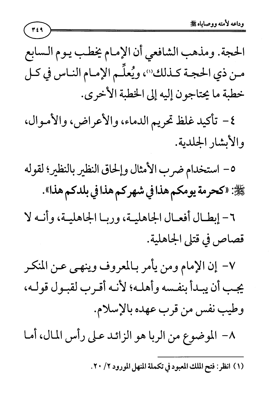 5 - استخدام ضرب الأمثال وإلحاق النظير بالنظير؛ لقوله صلى الله عليه وسلم: «كحرمة يومكم هذا في شهركم هذا في بلدكم هذا».