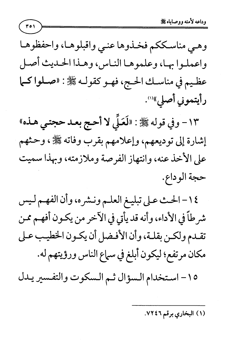 13 - وفي قوله صلى الله عليه وسلم: «لَعَلِّي لا أحج بعد حجتي هذه» إشارة إلى توديعهم، وإعلامهم بقرب وفاته صلى الله عليه وسلم، وحثهم على الأخذ عنه، وانتهاز الفرصة وملازمته، وبهذا سميت حجة الوداع.