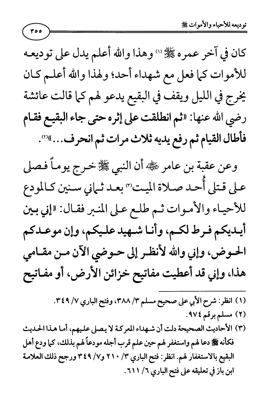 (¬3) الأحاديث الصحيحة دلت أن شهداء المعركة لا يصلى عليهم, أما هذا الحديث فكأنه - صلى الله عليه وسلم - دعا لهم واستغفر لهم حين علم قرب أجله مودعاً لهم بذلك, كما ودع أهل البقيع بالاستغفار لهم. انظر: فتح الباري 3/ 210 و7/ 349 ورجح ذلك العلامة ابن باز في تعليقه على فتح الباري 6/ 611.