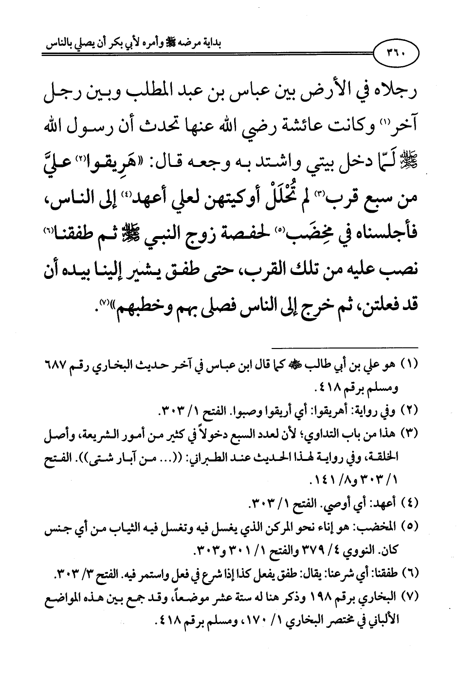 رجلاه في الأرض بين عباس بن عبد المطلب وبين رجل آخر» (¬1) وكانت عائشة رضي الله عنها تحدث «أن رسول الله صلى الله عليه وسلم لَمَّا دخل بيتي واشتد به وجعه قال: هَرِيقوا (¬2) عليَّ من سبع قرب (¬3) لم تُحْلَلْ أوكيتهن لعلي أعهد (¬4) إلى الناس، فأجلسناه في مِخضَب (¬5) لحفصة زوج النبي صلى الله عليه وسلم ثم طفقنا (¬6) نصب عليه من تلك القرب، حتى طفق يشير إلينا بيده أن قد فعلتن، ثم خرج إلى الناس فصلى بهم وخطبهم» (¬7).
