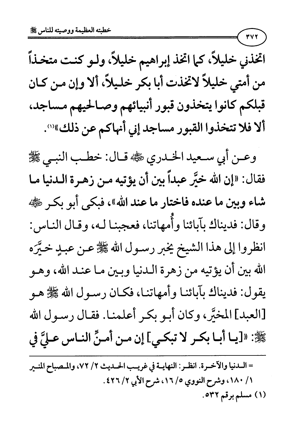 وعن أبي سعيد الخدري رضي الله عنه قال: خطب النبي صلى الله عليه وسلم فقال: «إن الله خيَّر عبدًا بين أن يؤتيه من زهرة الدنيا ما شاء وبين ما عنده فاختار ما عند الله"، فبكى أبو بكر رضي الله عنه وقال: فديناك بآبائنا وأُمهاتنا، فعجبنا له، وقال الناس: انظروا إلى هذا الشيخ يخبر رسول الله صلى الله عليه وسلم عن عبدٍ خيَّرَه الله بين أن يؤتيه من زهرة الدنيا وبين ما عند الله، وهو يقول: فديناك بآبائنا وأمهاتنا، فكان رسول الله صلى الله عليه وسلم هو [العبد] المخيَّر، وكان أبو بكر أعلمنا. فقال رسول الله صلى الله عليه وسلم: " [يا أبا بكر لا تبكي] إن من أمنِّ الناس عليَّ في