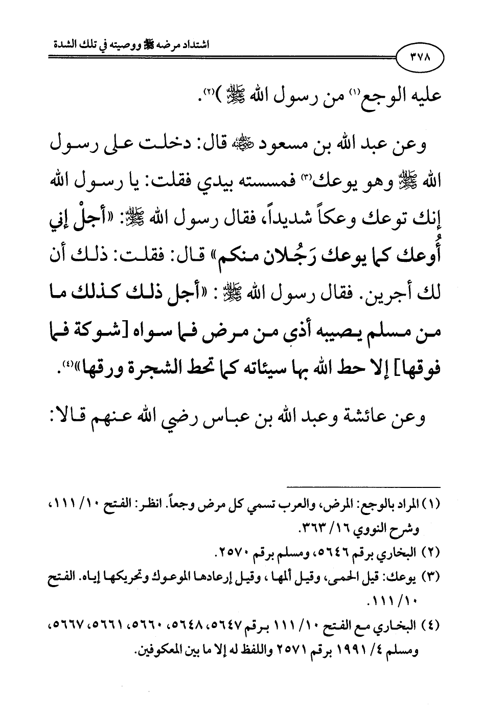 وعن عبد الله بن مسعود رضي الله عنه قال: «دخلت على رسول الله صلى الله عليه وسلم وهو يوعك (¬3) فمسسته بيدي فقلت: يا رسول الله إنك توعك وعكًا شديدًا، فقال رسول الله صلى الله عليه وسلم: أجلْ إني أُوعك كما يوعك رَجُلان منكم، قال: فقلت: ذلك أن لك أجرين. فقال رسول الله صلى الله عليه وسلم: أجل ذلك كذلك ما من مسلم يصيبه أذى من مرض فما سواه [شوكة فما فوقها] إلا حط الله بها سيئاته كما تحط الشجرة ورقها» (¬4).