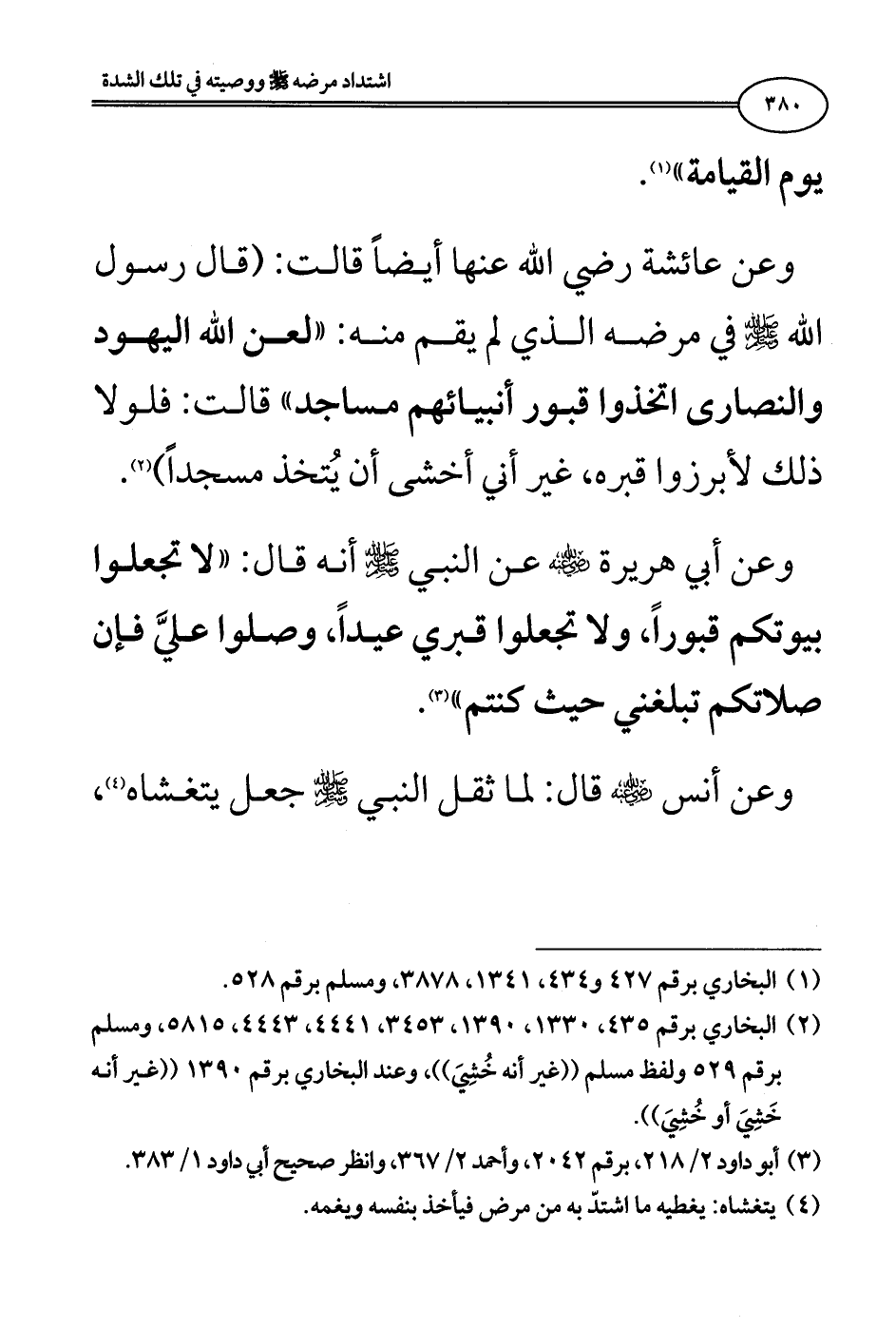 وعن عائشة رضي الله عنها أيضًا قالت: «قال رسول الله صلى الله عليه وسلم في مرضه الذي لم يقم منه: لعن الله اليهود والنصارى اتخذوا قبور أنبيائهم مساجد، قالت: فلولا ذلك لأبرزوا قبره، غير أني أخشى أن يُتخذ مسجدًا» (¬2).