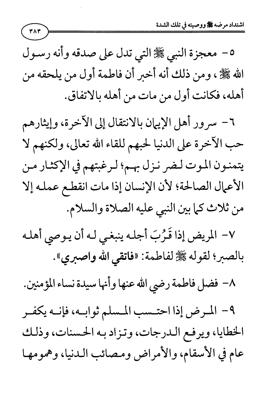 5 - معجزة النبي صلى الله عليه وسلم التي تدل على صدقه وأنه رسول الله صلى الله عليه وسلم، ومن ذلك أنه أخبر أن فاطمة أول من يلحقه من أهله، فكانت أول من مات من أهله بالاتفاق.