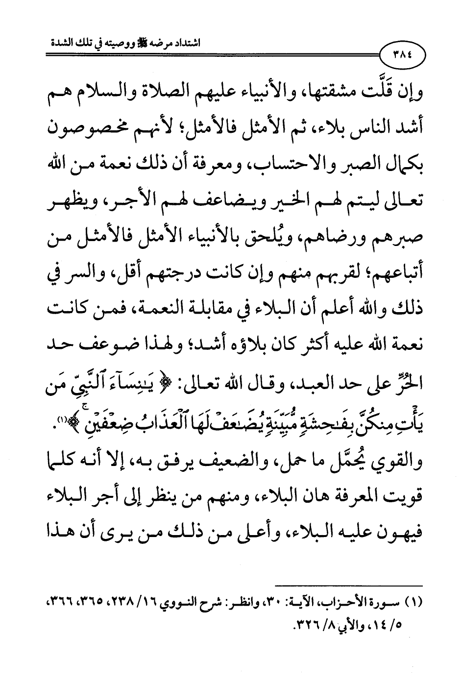 وإن قَلَّت مشقتها، والأنبياء عليهم الصلاة والسلام هم أشد الناس بلاء، ثم الأمثل فالأمثل؛ لأنهم مخصوصون بكمال الصبر والاحتساب، ومعرفة أن ذلك نعمة من الله تعالى ليتم لهم الخير ويضاعف لهم الأجر، ويظهر صبرهم ورضاهم، ويُلحق بالأنبياء الأمثل فالأمثل من أتباعهم؛ لقربهم منهم وإن كانت درجتهم أقل، والسر في ذلك والله أعلم أن البلاء في مقابلة النعمة، فمن كانت نعمة الله عليه أكثر كان بلاؤه أشد؛ ولهذا ضوعف حد الحُرِّ على حد العبد، وقال الله تعالى: {يَانِسَاءَ النَّبِيِّ مَنْ يَأْتِ مِنْكُنَّ بِفَاحِشَةٍ مُبَيِّنَةٍ يُضَاعَفْ لَهَا الْعَذَابُ ضِعْفَيْنِ} [الأحزاب: 30] والقوي يُحمَّل ما حمل، والضعيف يرفق به، إلا أنه كلما قويت المعرفة هان البلاء، ومنهم من ينظر إلى أجر البلاء فيهون عليه البلاء، وأعلى من ذلك من يرى أن هذا