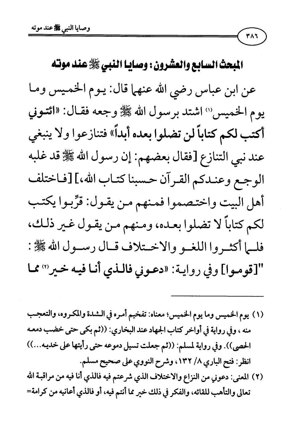 عن ابن عباس رضي الله عنهما قال: يوم الخميس وما يوم الخميس (¬1) «اشتد برسول الله صلى الله عليه وسلم وجعه فقال: ائتوني أكتب لكم كتابًا لن تضلوا بعده أبدًا، فتنازعوا ولا ينبغي عند نبي التنازع [فقال بعضهم: إن رسول الله صلى الله عليه وسلم قد غلبه الوجع وعندكم القرآن حسبنا كتاب الله،] [فاختلف أهل البيت واختصموا فمنهم من يقول: قرِّبوا يكتب لكم كتابًا لا تضلوا بعده، ومنهم من يقول غير ذلك، فلما أكثروا اللغو والاختلاف قال رسول الله صلى الله عليه وسلم: [قوموا] وفي رواية: دعوني فالذي أنا فيه خير (¬2) مما