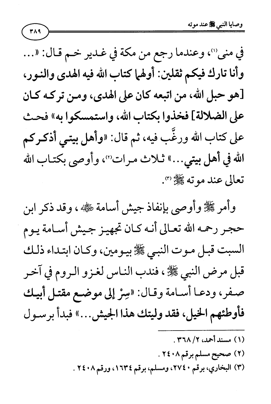 في منى (¬1) وعندما رجع من مكة في غدير خم قال: «. . . وأنا تارك فيكم ثقلين: أولهما كتاب الله فيه الهدى والنور، [هو حبل الله، من اتبعه كان على الهدى، ومن تركه كان على الضلالة] فخذوا بكتاب الله، واستمسكوا به، فحث على كتاب الله ورغَّب فيه، ثم قال: وأهل بيتي أذكركم الله في أهل بيتي. . .» ثلاث مرات (¬2) وأوصى بكتاب الله تعالى عند موته صلى الله عليه وسلم (¬3).