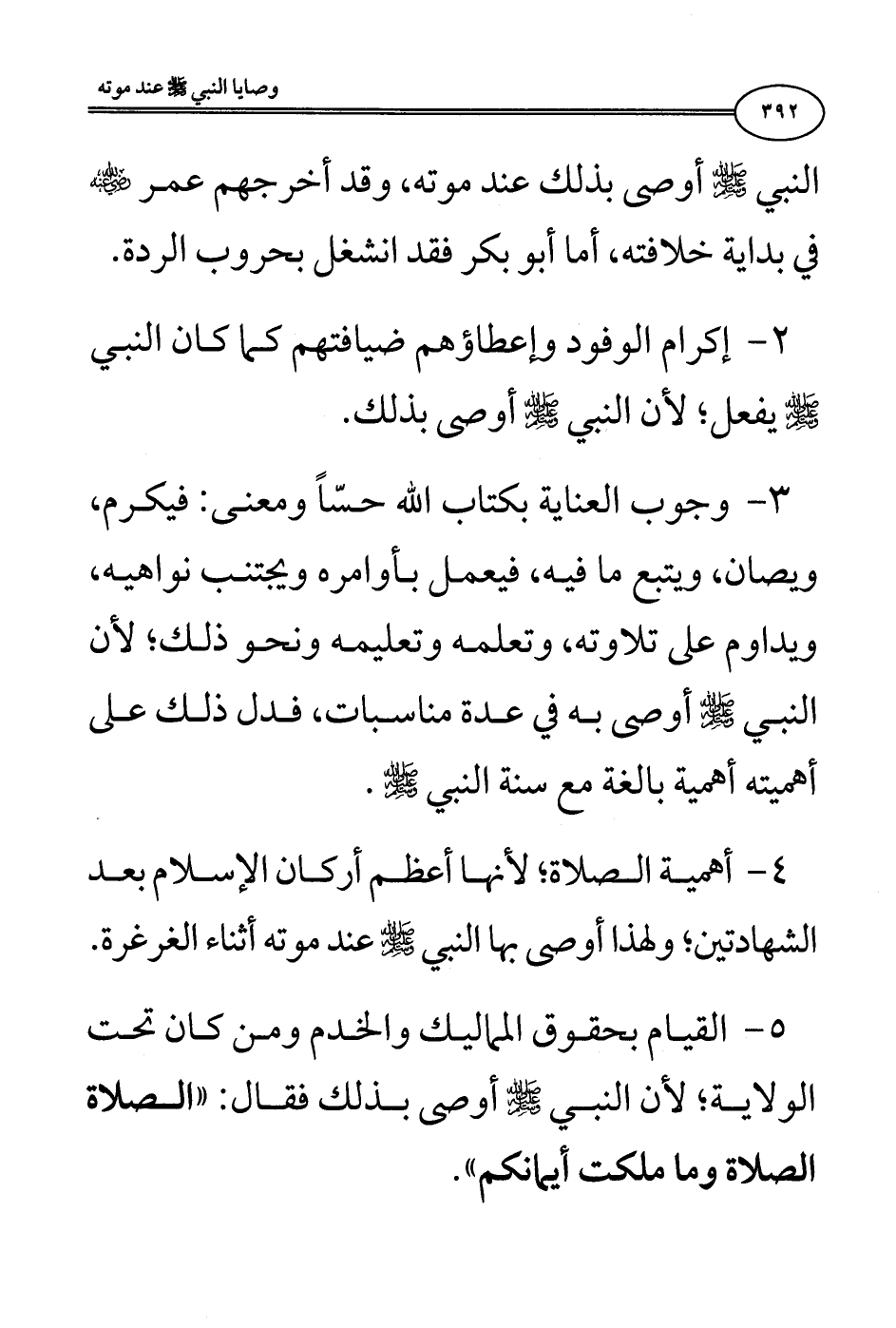 3 - وجوب العناية بكتاب الله حسًّا ومعنى: فيكرم، ويصان، ويتبع ما فيه، فيعمل بأوامره ويجتنب نواهيه، ويداوم على تلاوته، وتعلمه وتعليمه ونحو ذلك؛ لأن النبي صلى الله عليه وسلم أوصى به في عدة مناسبات، فدل ذلك على أهميته أهمية بالغة مع سنة النبي صلى الله عليه وسلم.