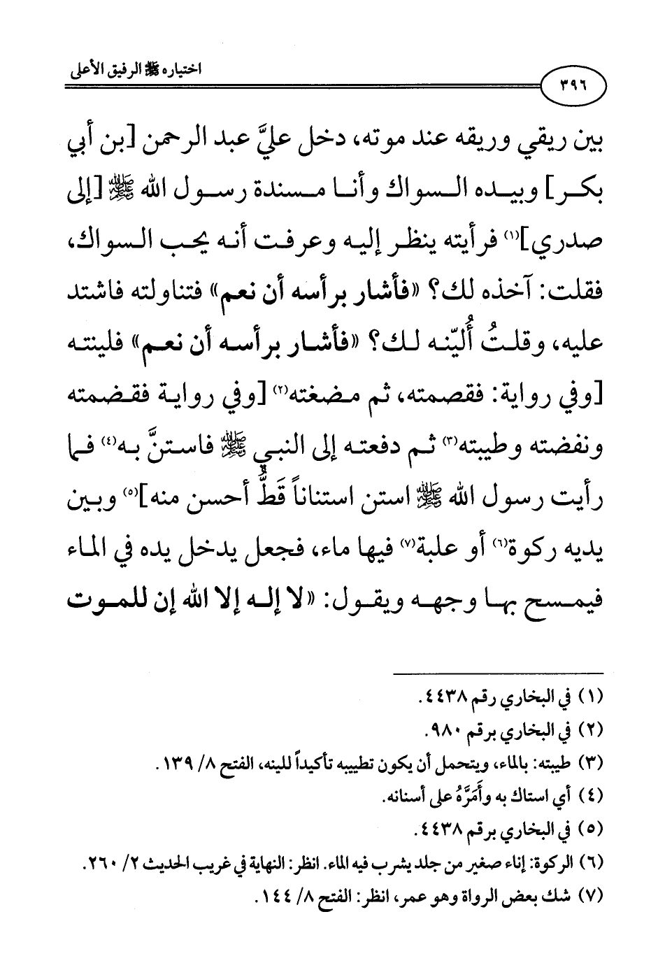 بين ريقي وريقه عند موته، دخل عليَّ عبد الرحمن [بن أبي بكر] وبيده السواك وأنا مسندة رسول الله صلى الله عليه وسلم [إلى صدري] (¬1) فرأيته ينظر إليه وعرفت أنه يحب السواك، فقلت: آخذه لك؟ فأشار برأسه أن نعم، فتناولته فاشتد عليه، وقلتُ أُليِّنه لك؟ فأشار برأسه أن نعم، فلينته [وفي رواية: فقصمته، ثم مضغته (¬2) وفي رواية فقضمته ونفضته وطيبته (¬3) ثم دفعته إلى النبي صلى الله عليه وسلم فاستنَّ به (¬4) فما رأيت رسول الله صلى الله عليه وسلم استن استنانًا قَطُّ أحسن منه] (¬5) وبين يديه ركوة (¬6)