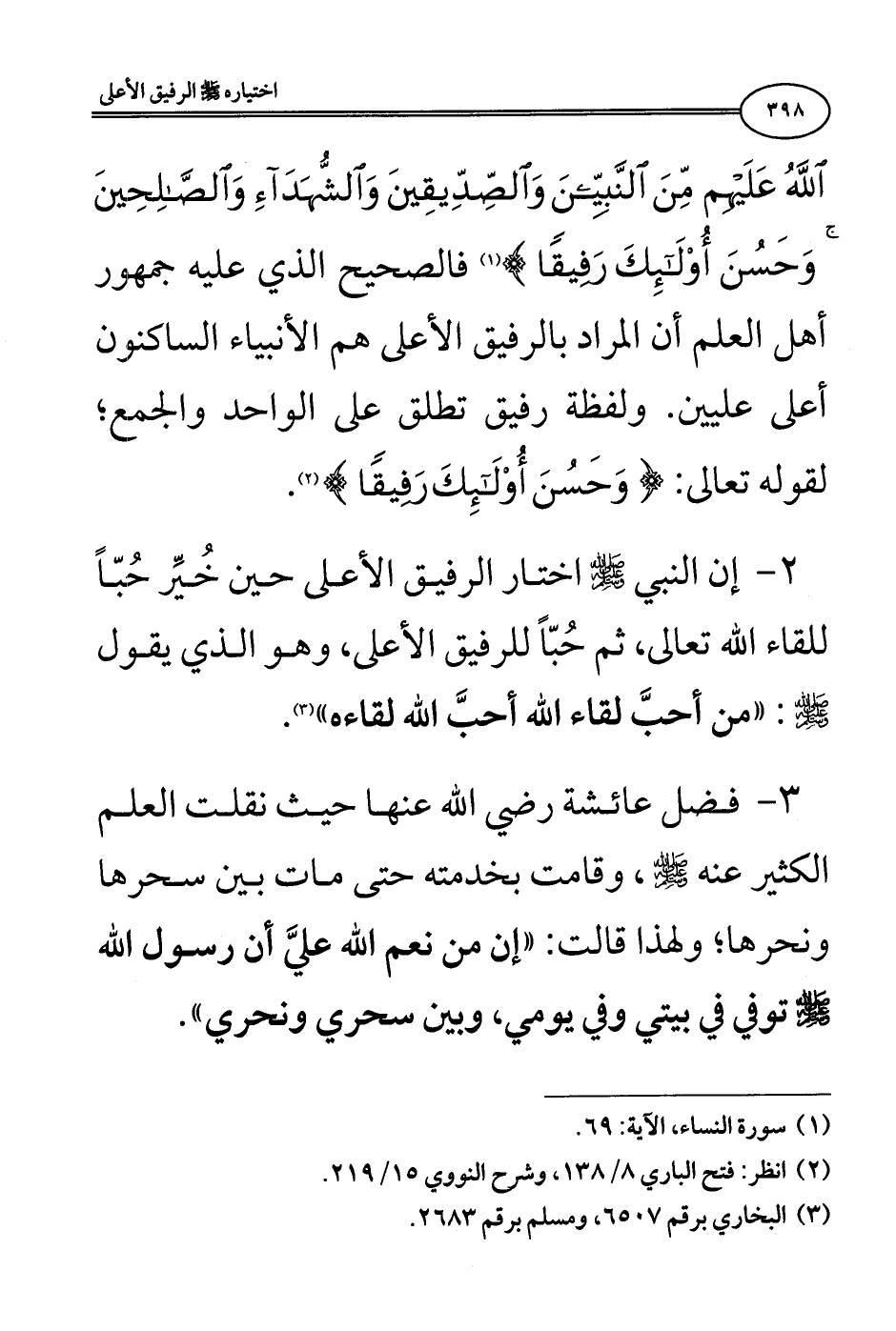 2 - إن النبي صلى الله عليه وسلم اختار الرفيق الأعلى حين خُيِّر حُبًّا للقاء الله تعالى، ثم حُبًّا للرفيق الأعلى، وهو الذي يقول صلى الله عليه وسلم: «من أحبَّ لقاء الله أحبَّ الله لقاءه» (¬2).