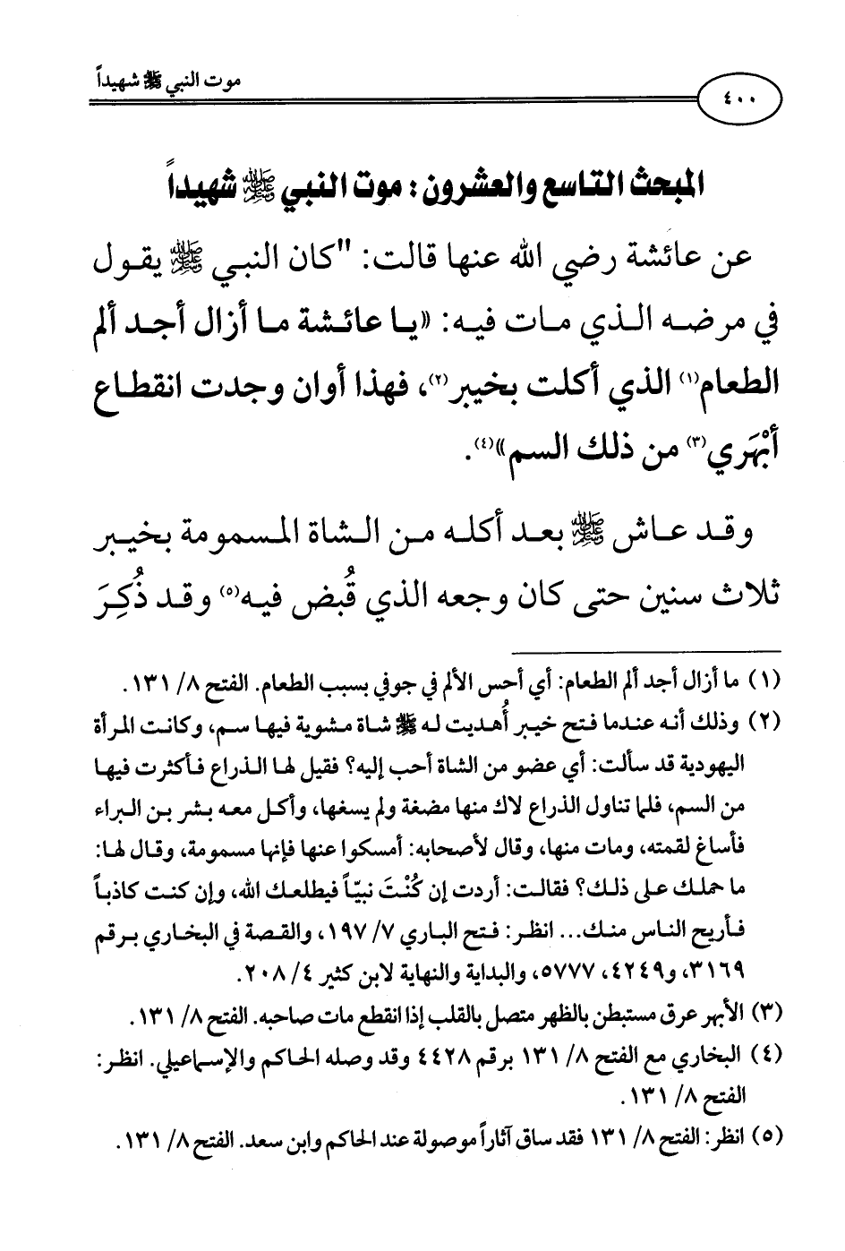 (¬2) وذلك أنه عندما فتح خيبر أُهديت له - صلى الله عليه وسلم - شاة مشوية فيها سم, وكانت المرأة اليهودية قد سألت: أي عضو من الشاة أحب إليه؟ فقيل لها الذراع فأكثرت فيها من السم, فلما تناول الذراع لاك منها مضغة ولم يسغها, وأكل معه بشر بن البراء فأساغ لقمته, ومات منها, وقال لأصحابه: أمسكوا عنها فإنها مسمومة, وقال لها: ما حملك على ذلك؟ فقالت: أردت إن كُنْتَ نبيّاً فيطلعك الله, وإن كنت كاذباً فأريح الناس منك ... انظر: فتح الباري 7/ 197, والقصة في البخاري برقم 3169, و4249, 5777, والبداية والنهاية لابن كثير 4/ 208.