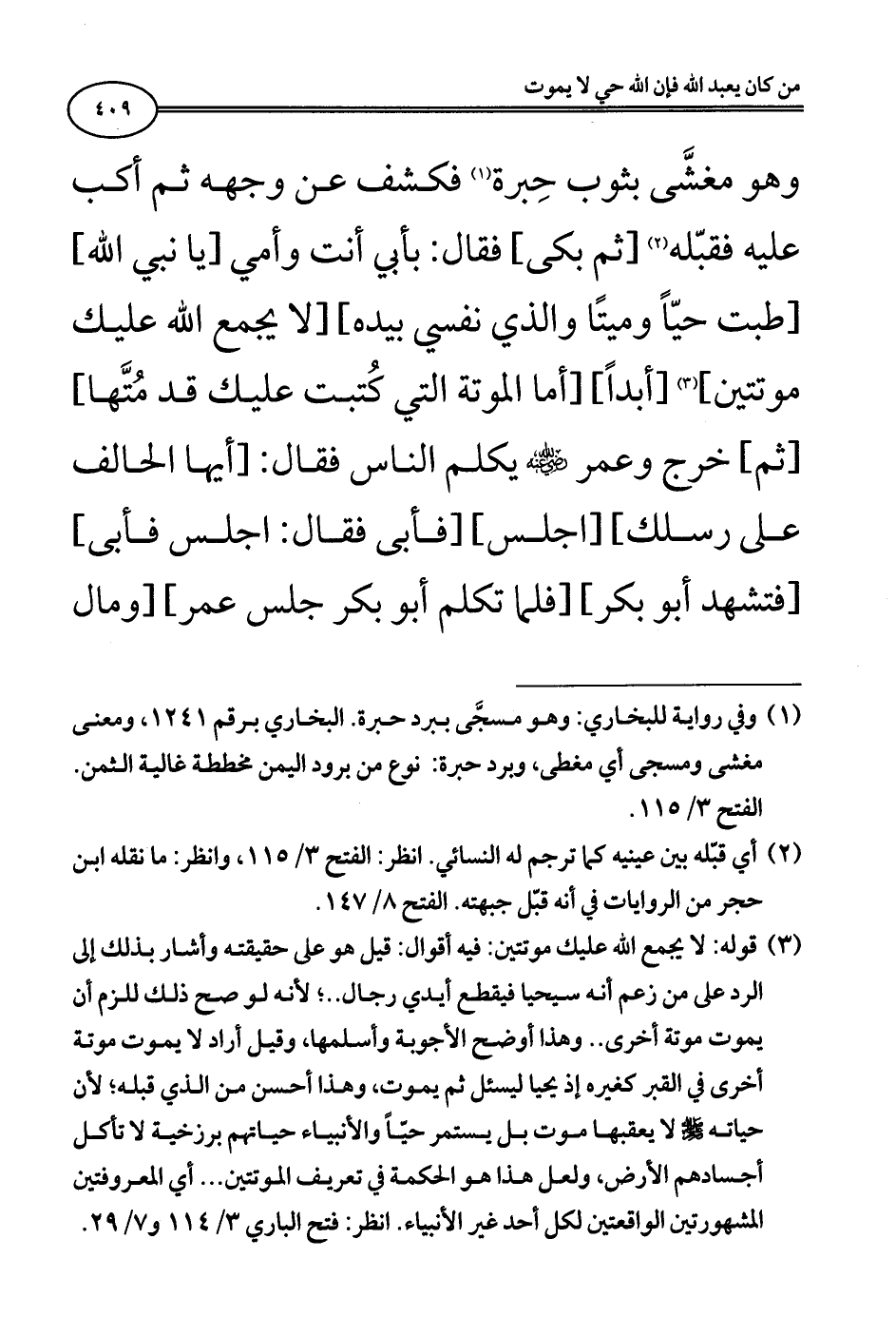 [أبدًا] [أما الموتة التي كُتبت عليك قد مُتَّها] [ثم] خرج وعمر رضى الله عنه يكلم الناس فقال: [أيها الحالف على رسلك] [اجلس] [فأبى فقال: اجلس فأبى] [فتشهد أبو بكر] [فلما تكلم أبو بكر جلس عمر] [ومال