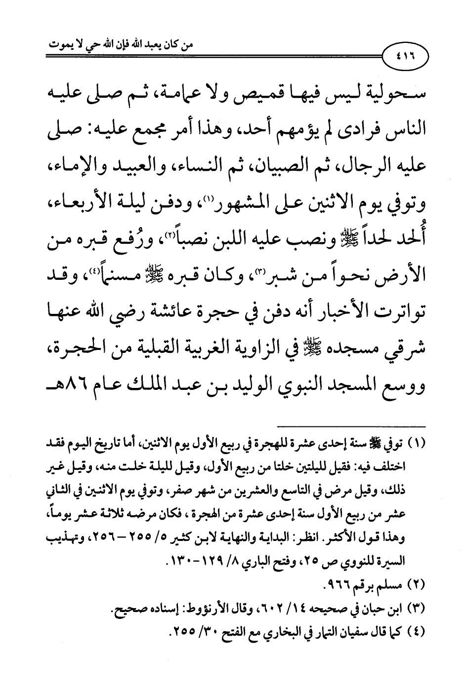 سحولية ليس فيها قميص ولا عمامة، ثم صلى عليه الناس فرادى لم يؤمهم أحد، وهذا أمر مجمع عليه: صلى عليه الرجال، ثم الصبيان، ثم النساء، والعبيد والإماء، وتوفي يوم الاثنين على المشهور (¬1) ودفن ليلة الأربعاء، أُلحد لحدًا صلى الله عليه وسلم ونصب عليه اللبن نصبًا (¬2) ورُفع قبره من الأرض نحوًا من شبر (¬3) وكان قبره صلى الله عليه وسلم مسنمًا (¬4) وقد تواترت الأخبار أنه دفن في حجرة عائشة رضي الله عنها شرقي مسجده صلى الله عليه وسلم في الزاوية الغربية القبلية من الحجرة، ووسع المسجد النبوي الوليد بن عبد الملك عام 86هـ