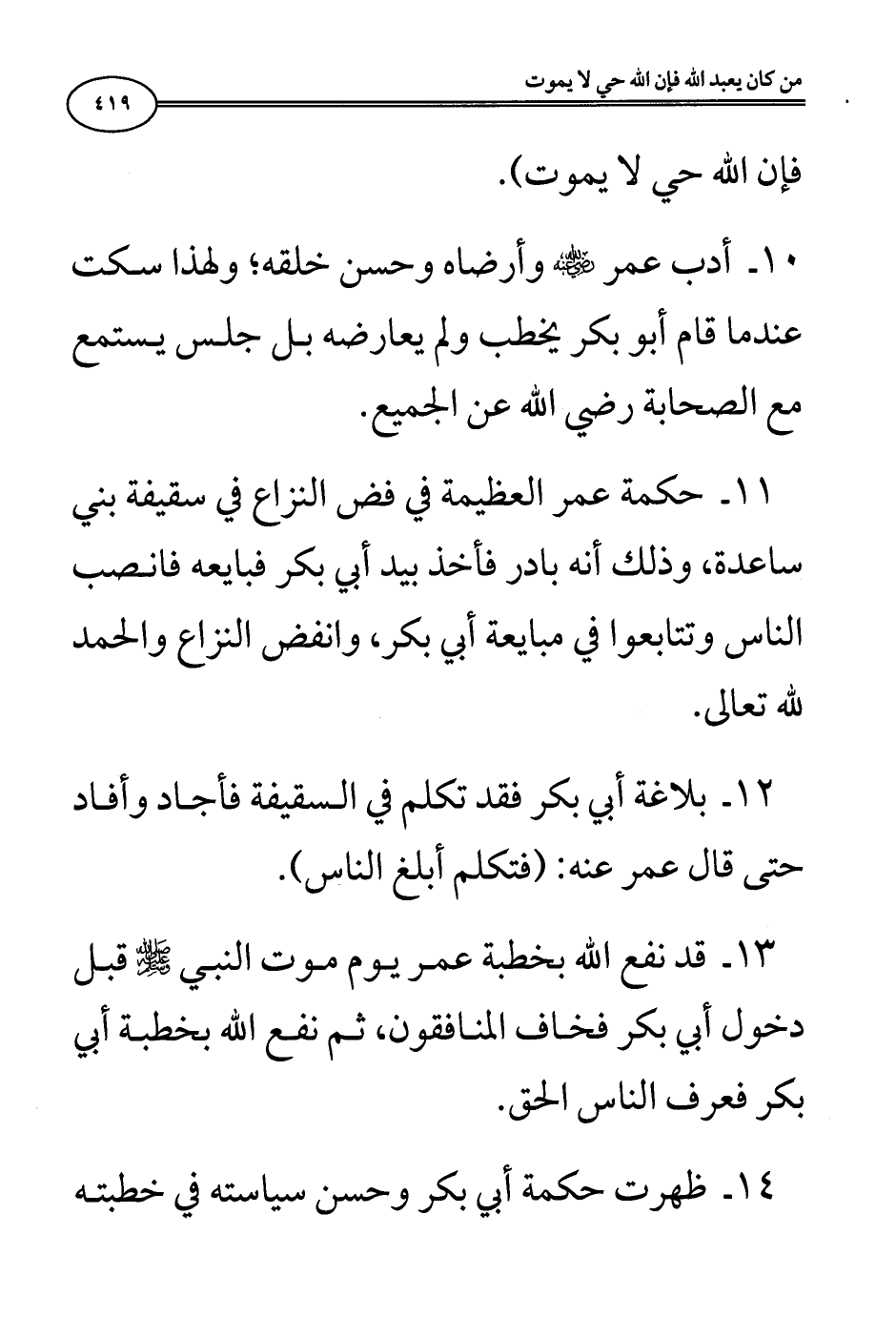 11 - حكمة عمر العظيمة في فض النزاع في سقيفة بني ساعدة، وذلك أنه بادر فأخذ بيد أبي بكر فبايعه فانصب الناس وتتابعوا في مبايعة أبي بكر، وانفض النزاع والحمد لله تعالى.