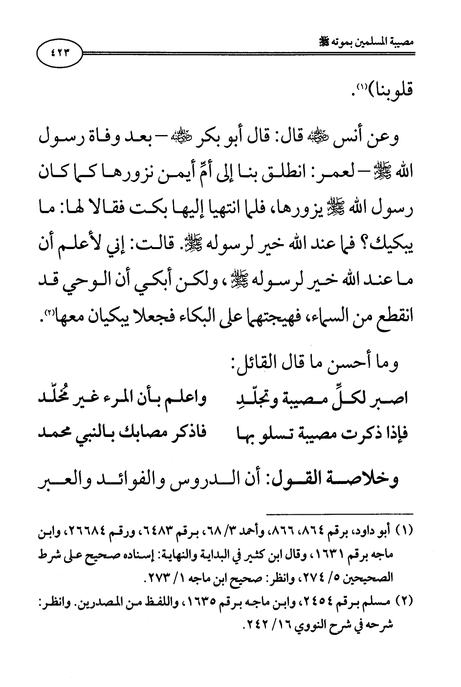 (¬1) أبو داود، برقم 864، 866, وأحمد 3/ 68, برقم 6483، ورقم 26684، وابن ماجه برقم 1631, وقال ابن كثير في البداية والنهاية: إسناده صحيح على شرط الصحيحين 5/ 274, وانظر: صحيح ابن ماجه 1/ 273.