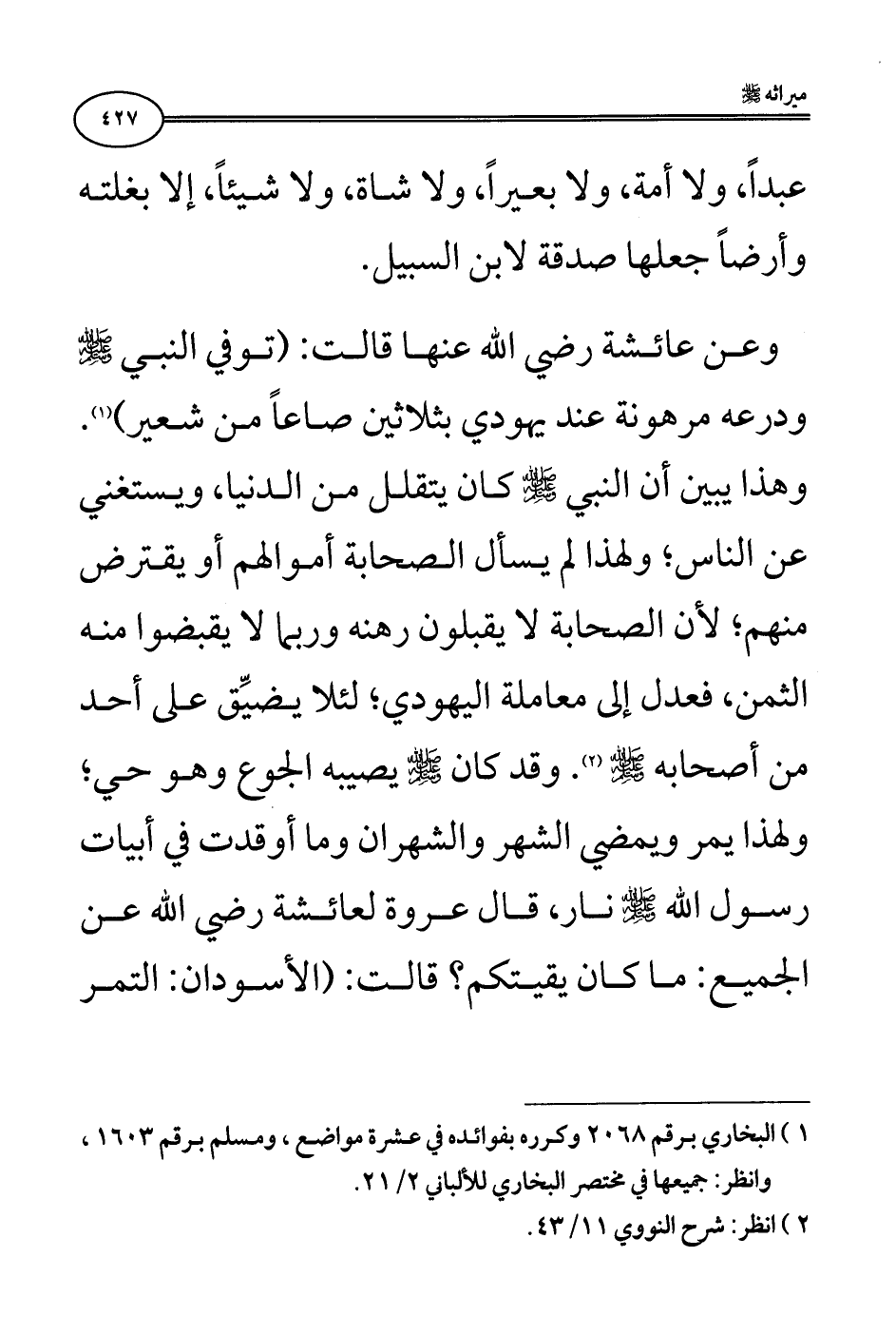 وعن عائشة رضي الله عنها قالت: «توفي النبي صلى الله عليه وسلم ودرعه مرهونة عند يهودي بثلاثين صاعًا من شعير» (¬1). وهذا يبين أن النبي صلى الله عليه وسلم كان يتقلل من الدنيا، ويستغني عن الناس؛ ولهذا لم يسأل الصحابة أموالهم أو يقترض منهم؛ لأن الصحابة لا يقبلون رهنه وربما لا يقبضوا منه الثمن، فعدل إلى معاملة اليهودي؛ لئلا يضيِّق على أحد من أصحابه صلى الله عليه وسلم (¬2). وقد كان صلى الله عليه وسلم يصيبه الجوع وهو حي؛ ولهذا يمر ويمضي الشهر والشهران وما أوقدت في أبيات رسول الله صلى الله عليه وسلم نار، «قال عروة لعائشة رضي الله عن الجميع: ما كان يقيتكم؟ قالت: الأسودان: التمر