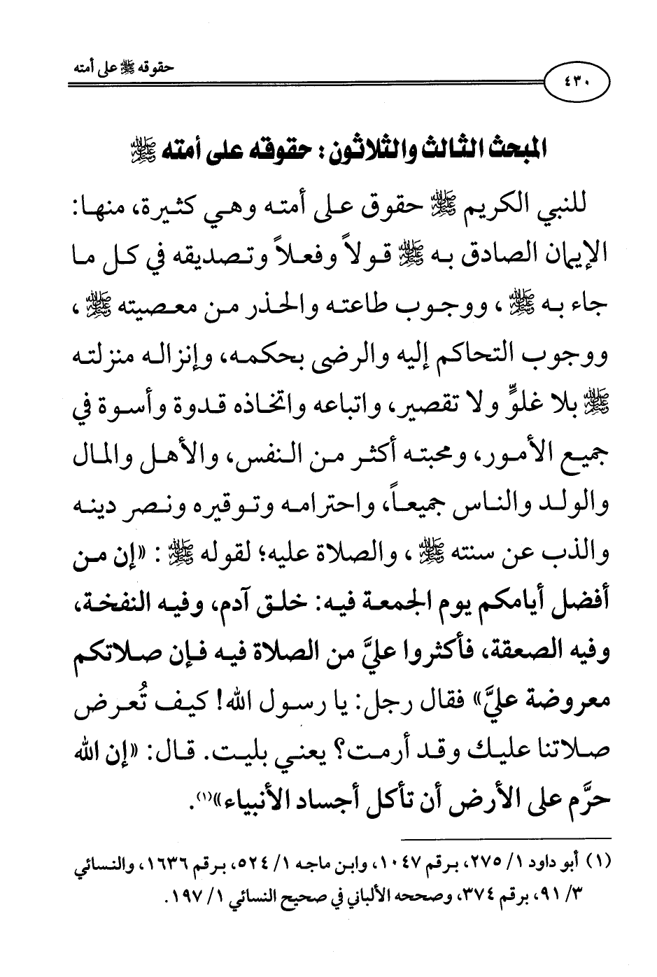 للنبي الكريم صلى الله عليه وسلم حقوق على أمته وهي كثيرة، منها: الإيمان الصادق به صلى الله عليه وسلم قولًا وفعلًا وتصديقه في كل ما جاء به صلى الله عليه وسلم، ووجوب طاعته والحذر من معصيته صلى الله عليه وسلم، ووجوب التحاكم إليه والرضى بحكمه، وإنزاله منزلته صلى الله عليه وسلم بلا غلوٍّ ولا تقصير، واتباعه واتخاذه قدوة وأسوة في جميع الأمور، ومحبته أكثر من النفس، والأهل والمال والولد والناس جميعًا، واحترامه وتوقيره ونصر دينه والذب عن سنته صلى الله عليه وسلم، والصلاة عليه؛ لقوله صلى الله عليه وسلم: «إن من أفضل أيامكم يوم الجمعة فيه. خلق آدم، وفيه النفخة، وفيه الصعقة، فأكثروا عليَّ من الصلاة فيه فإن صلاتكم معروضة عليَّ، فقال رجل. يا رسول الله! كيف تُعرض صلاتنا عليك وقد أرمت؟ يعني بليت. قال: إن الله حرَّم على الأرض أن تأكل أجساد الأنبياء» (¬1).