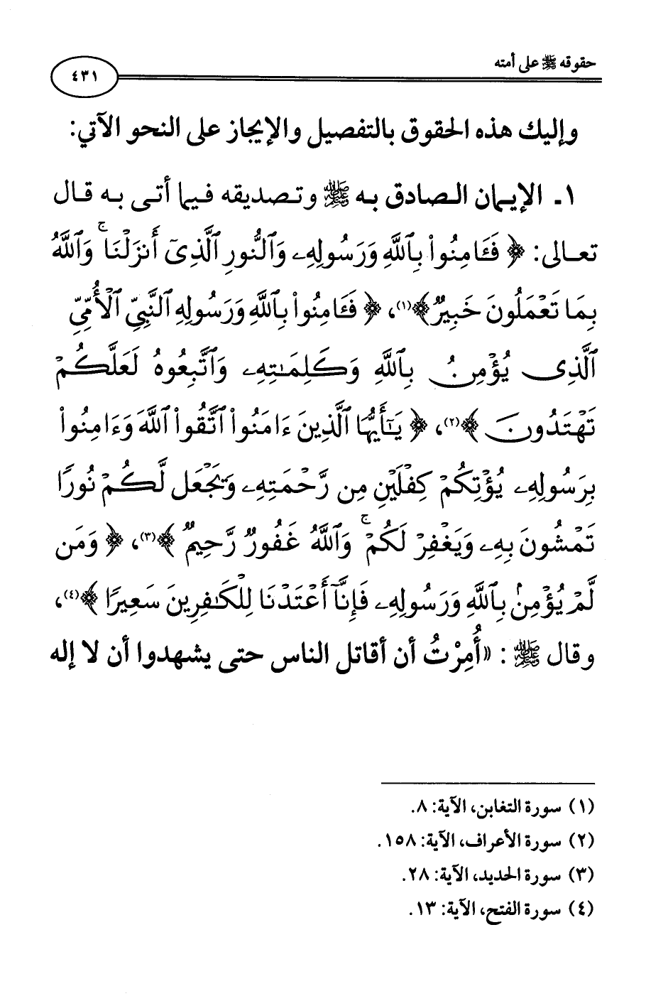 وإليك هذه الحقوق بالتفصيل والإيجاز على النحو الآتي: 1 - الإيمان الصادق به صلى الله عليه وسلم وتصديقه فيما أتى به: قال تعالى: {فَآمِنُوا بِاللَّهِ وَرَسُولِهِ وَالنُّورِ الَّذِي أَنْزَلْنَا وَاللَّهُ بِمَا تَعْمَلُونَ خَبِيرٌ} [التغابن: 8]، {فَآمِنُوا بِاللَّهِ وَرَسُولِهِ النَّبِيِّ الْأُمِّيِّ الَّذِي يُؤْمِنُ بِاللَّهِ وَكَلِمَاتِهِ وَاتَّبِعُوهُ لَعَلَّكُمْ تَهْتَدُونَ} [الأعراف: 158]، {يَاأَيُّهَا الَّذِينَ آمَنُوا اتَّقُوا اللَّهَ وَآمِنُوا بِرَسُولِهِ يُؤْتِكُمْ كِفْلَيْنِ مِنْ رَحْمَتِهِ وَيَجْعَلْ لَكُمْ نُورًا تَمْشُونَ بِهِ وَيَغْفِرْ لَكُمْ وَاللَّهُ غَفُورٌ رَحِيمٌ} [الحديد: 28]، {وَمَنْ لَمْ يُؤْمِنْ بِاللَّهِ وَرَسُولِهِ فَإِنَّا أَعْتَدْنَا لِلْكَافِرِينَ سَعِيرًا} [الفتح: 13]، وقال صلى الله عليه وسلم: «أُمِرْتُ أن أقاتل الناس حتى يشهدوا أن لا