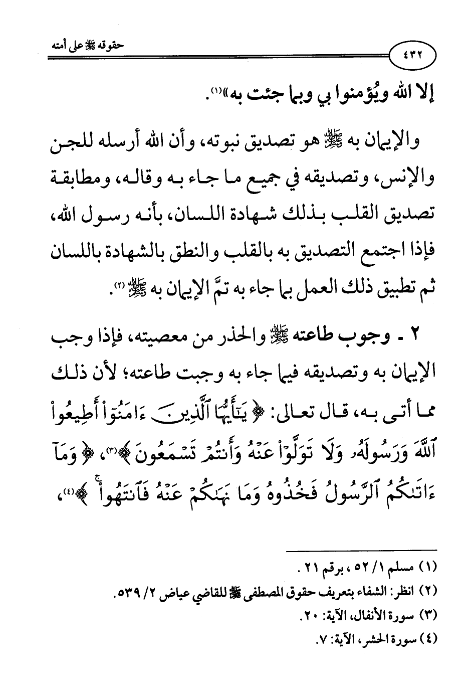2 - وجوب طاعته صلى الله عليه وسلم والحذر من معصيته: فإذا وجب الإيمان به وتصديقه فيما جاء به وجبت طاعته؛ لأن ذلك مما أتى به، قال تعالى: {يَاأَيُّهَا الَّذِينَ آمَنُوا أَطِيعُوا اللَّهَ وَرَسُولَهُ وَلَا تَوَلَّوْا عَنْهُ وَأَنْتُمْ تَسْمَعُونَ} [الأنفال: 20]، {وَمَا آتَاكُمُ الرَّسُولُ فَخُذُوهُ وَمَا نَهَاكُمْ عَنْهُ فَانْتَهُوا} [الحشر: 7]،