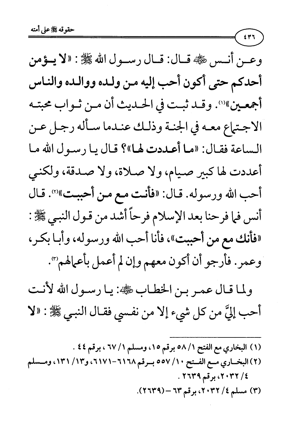 وعن أنس رضي الله عنه قال: قال رسول الله صلى الله عليه وسلم: «لا يؤمن أحدكم حتى أكون أحب إليه من ولده ووالده والناس أجمعين» (¬1). وقد ثبت في الحديث أن من ثواب محبته الاجتماع معه في الجنة، «وذلك عندما سأله رجل عن الساعة فقال: "ما أعددت لها"؟ قال: يا رسول الله ما أعددت لها كبير صيام، ولا صلاة، ولا صدقة، ولكني أحب الله ورسوله. قال: "فأنت مع من أحببت" (¬2). قال أنس: فما فرحنا بعد الإسلام فرحًا أشد من قول النبي صلى الله عليه وسلم: "فأنك مع من أحببت"، فأنا أحب الله ورسوله، وأبا بكر، وعمر، فأرجو أن أكون معهم وإن لم أعمل بأعمالهم» (¬3).