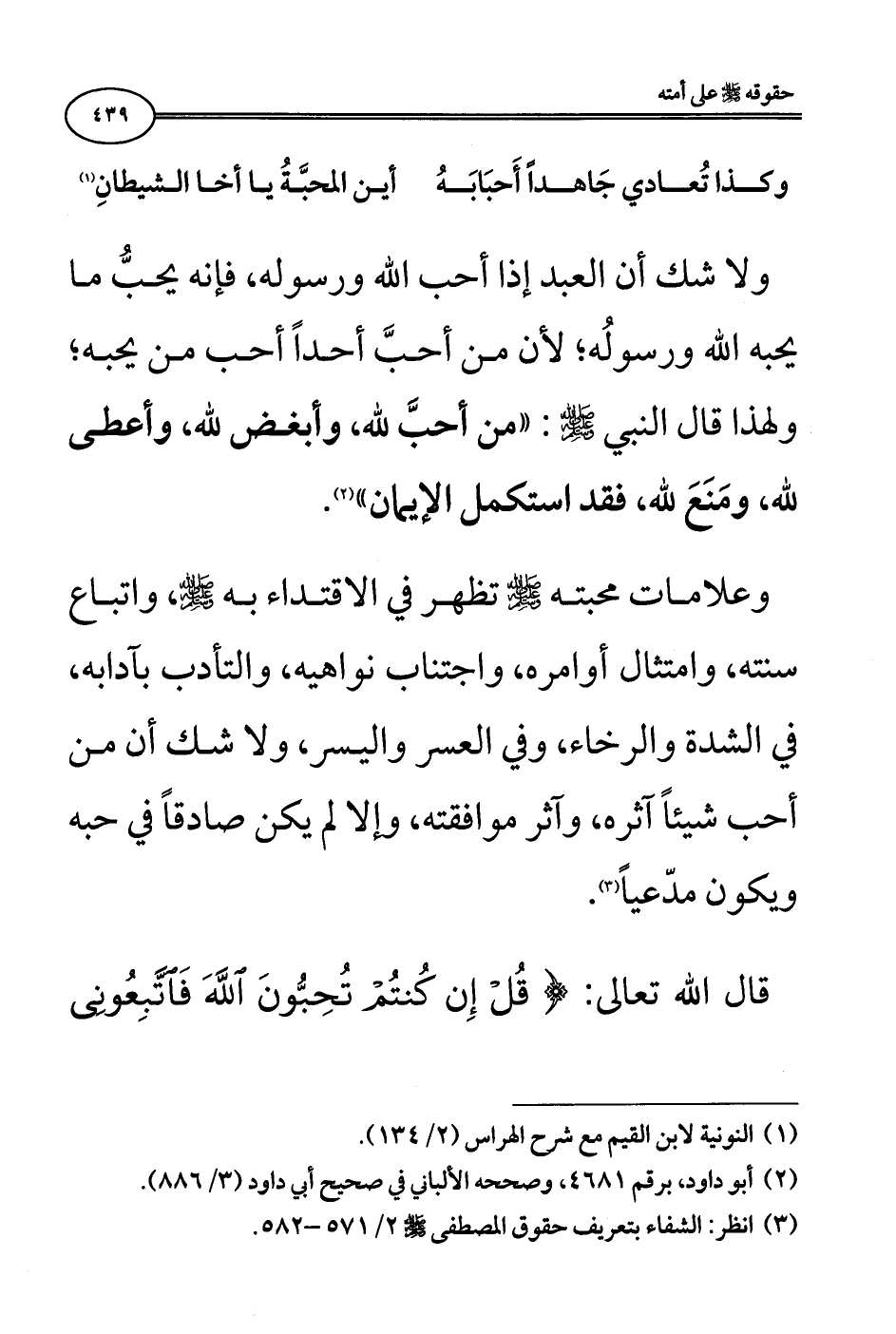 وعلامات محبته صلى الله عليه وسلم تظهر في الاقتداء به صلى الله عليه وسلم، واتباع سنته، وامتثال أوامره، واجتناب نواهيه، والتأدب بآدابه، في الشدة والرخاء، وفي العسر واليسر، ولا شك أن من أحب شيئًا آثره، وآثر موافقته، وإلا لم يكن صادقًا في حبه ويكون مدَّعِيًا (¬3).