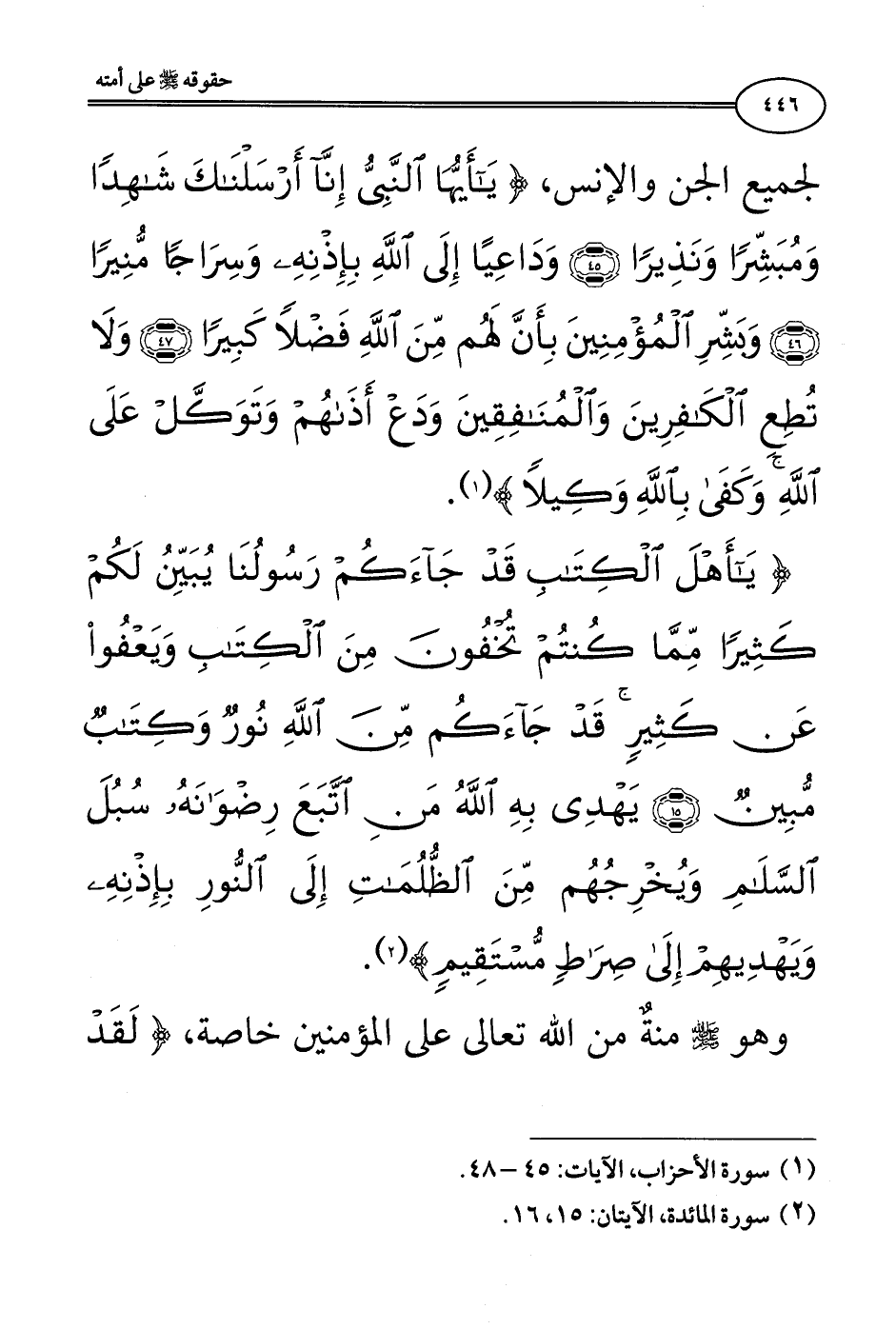 {يَاأَهْلَ الْكِتَابِ قَدْ جَاءَكُمْ رَسُولُنَا يُبَيِّنُ لَكُمْ كَثِيرًا مِمَّا كُنْتُمْ تُخْفُونَ مِنَ الْكِتَابِ وَيَعْفُو عَنْ كَثِيرٍ قَدْ جَاءَكُمْ مِنَ اللَّهِ نُورٌ وَكِتَابٌ مُبِينٌ - يَهْدِي بِهِ اللَّهُ مَنِ اتَّبَعَ رِضْوَانَهُ سُبُلَ السَّلَامِ وَيُخْرِجُهُمْ مِنَ الظُّلُمَاتِ إِلَى النُّورِ بِإِذْنِهِ وَيَهْدِيهِمْ إِلَى صِرَاطٍ مُسْتَقِيمٍ} [المائدة: 15 - 16].