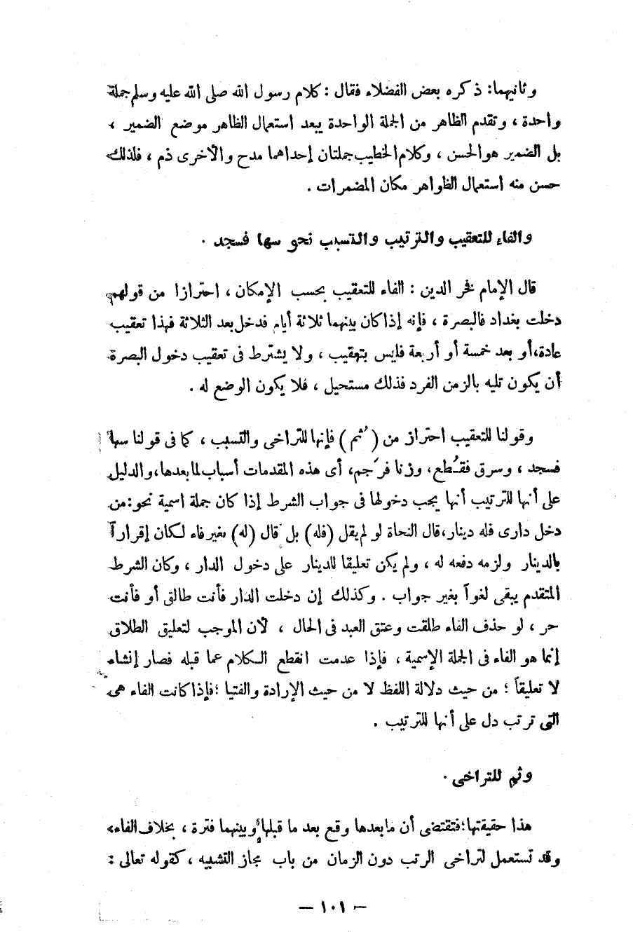 وقولنا للتعقيب احتراز من (ثُم) فإنها للتراخي والتسبب، كما في قولنا سها فسجد، وسرق فقُطع، وزنا فرُجم، أي هذه المقدمات أسباب لما بعدها، والدليل على أنها للترتيب أنها يجب دخولها في جواب الشرط إذا كان جملة اسمية نحو: من دخل داري فله دينار، قال النحاة لو لم يقل (فله) بل قال (له) بغير فاء لكان إقراراً بالدينار ولزمه دفعه له، ولم يكن تعليقاً للدينار على دخول الدار، وكان الشرط المتقدم يبقى لغواً بغير جواب. وكذلك إن دخلت الدار فأنت طالق أو فأنت حر، لو حذف الفاء طلقت وعتق العبد في الحال، لأن الموجب لتعليق الطلاق إنما هو الفاء في الجملة الاسمية، فإذا عدمت انقطع الكلام عما قبله فصار إنشاء لا تعليقاً؛ من حيث دلالة اللفظ لا من حيث الإرادة والفتيا؛ فإذا كانت الفاء هي التي ترتب دل على أنها للترتيب.