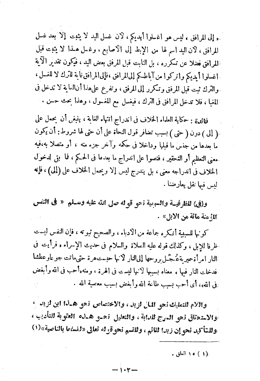 «إلى المرافق» ليس هو اغسلوا أيديكم، لأن غسل اليد لا يثبت إلا بعد غسل المرافق، لأن اليد اسم لها من الإبط إلى الأصابع، وغسل هذا لا يثبت قبل المرافق فضلاً عن تكرره، بل الثابت قبل المرفق بعض اليد، فيكون تقدير الآية اغسلوا أيديكم واتركوا من آباطكم إلى المرافق، فإلى المرافق غاية للترك لا للغسل، والترك ثبت قبل المرفق وتكرر إلى المرفق، وتفرع على هذا أن الغاية لا تدخل في المغيا، فلا تدخل المرافق في الترك، فيغسل مع المغسول، وهذا بحث حسن.