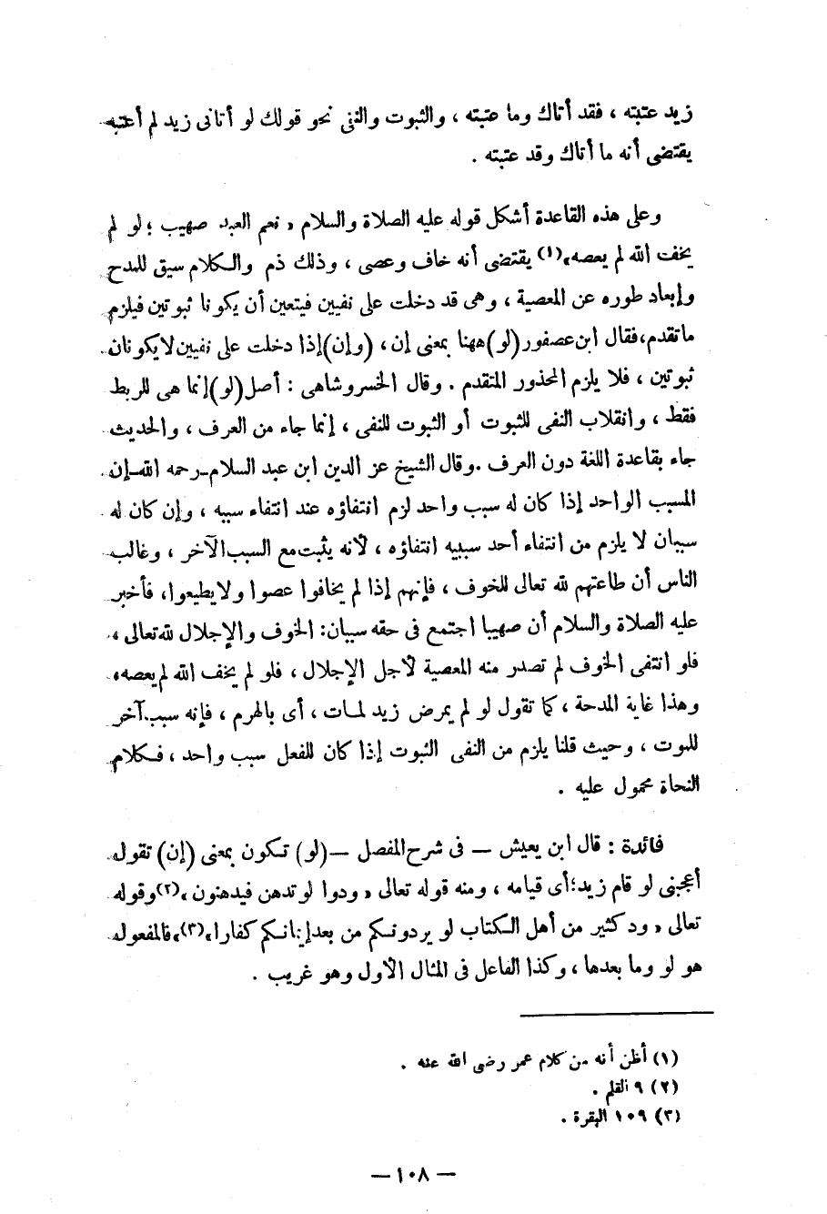 فائدة: قال ابن يعيش - في شرح المفصل - (لو) تكون بمعنى (إن) تقول أعجبني لو قام زيد؛ أي قيامه، ومنه قوله تعالى «ودوا لو تدهن فيدهنون» (¬2) وقوله تعالى «ود كثير من أهل الكتاب لو يردوكم من بعد إيمانكم كفاراً» (¬3) ، فالمفعوف هو لو وما بعدها، وكذا الفاعل في المثال الأول وهو غريب.