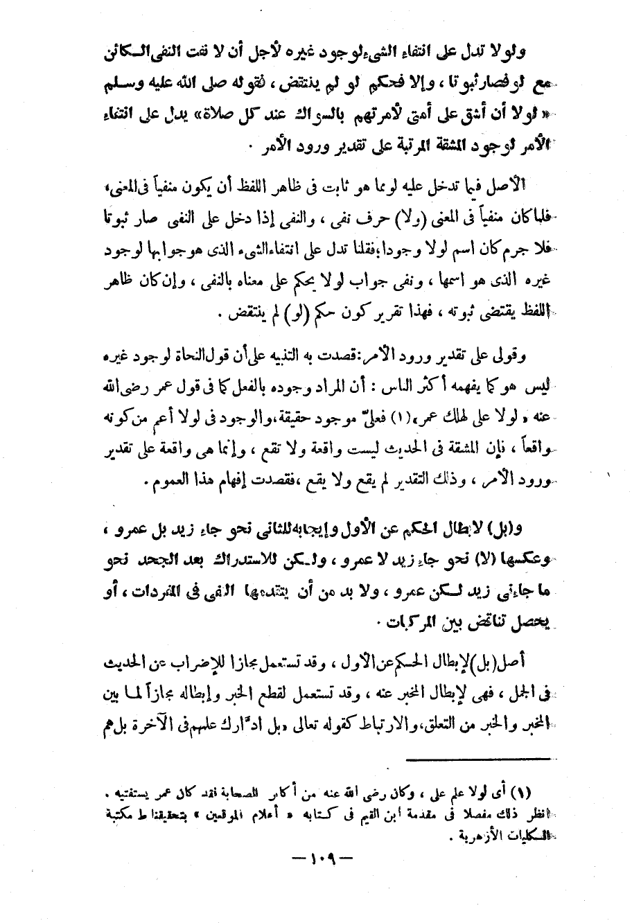وقولي على تقدير ورود الأمر: قصدت به التنبيه على أن قول النحاة لوجود غيره ليس هو كما يفهمه أكثر الناس: أن المراد وجوده بالفعل كما في قول عمر رضي الله عنه «لولا علي لهلك عمر» (¬1) فعليّ موجود حقيقة، والوجود في لولا أعم من كونه واقعاً، فإن المشقة في الحديث ليست واقعة ولا تقع، وإنما هي واقعة على تقدير ورود الأمر، وذلك التقدير لم يقع ولا يقع، فقصدت إفهام هذا العموم.