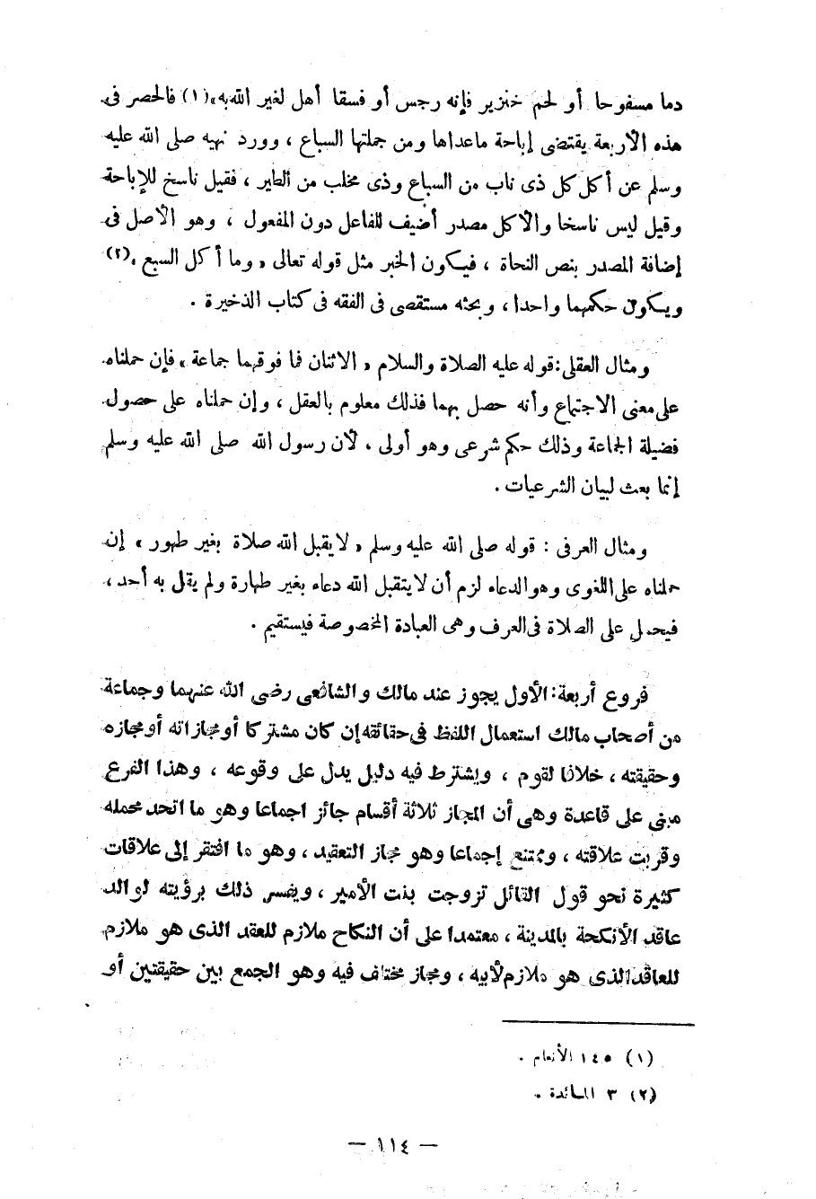 دماً مسفوحاً أو لحم خنزير فإنه رجس أو فسقاً أهل لغير الله به» (¬1) فالحصر في هذه الأربعة يقتضي إباحة ما عداها ومن جملتها السباع، وورد نهيه b عن أكل كل ذي ناب من السباع وذي مخلب من الطير، فقيل ناسخ للإباحة وقيل ليس ناسخاً والأكل مصدر أضيف للفاعل دون المفعول، وهو الأصل في إضافة المصدر بنص النحاة، فيكون الخبر مثل قوله تعالى «وما أكل السبع» (¬2) ويكون حكمها واحداً، وبحثه مستقصى في الفقه في كتاب الذخيرة.