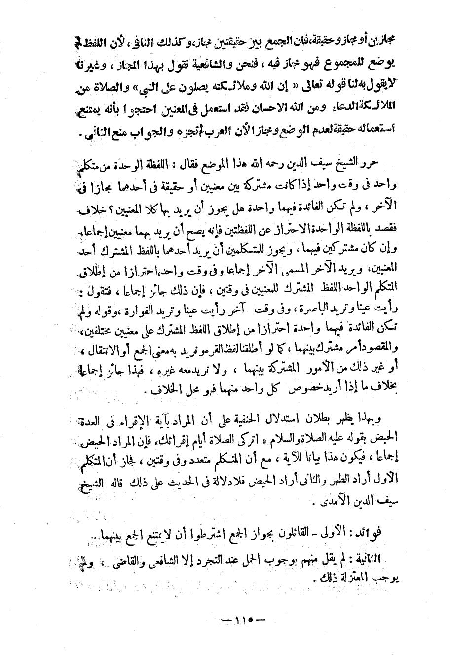 حرر الشيخ سيف الدين رحمه الله هذا الموضع فقال: اللفظة الوحدة من متكلم واحد في وقت واحد إذا كانت مشتركة بين معنيين أو حقيقة في أحدهما مجازاً في الآخر، ولم تكن الفائدة فيهما واحدة هل يجوز أن يريد بها كلا المعنيين؟ خلاف فقصد باللفظة الواحدة الاحتراز عن اللفظتين فإنه يصح أن يريد بهما معنيين إجماعاً، وإن كان مشتركين فيهما، ويجوز للمتكلمين أن يريد أحدهما باللفظ المشترك أحد المعنيين ويريد الآخر المسمى الآخر إجماعاً وفي وقت واحد، احترازاً من إطلاق المتكلم الواحد اللفظ المشترك للمعنيين في وقتين، فإن ذلك جائز إجماعاً، فتقول: رأيت عيناً وتريد الباصرة، وفي وقت آخر رأيت عيناً وتريد الفوارة، وقوله ولم تكن الفائدة فيهما واحدة احترازاً من إطلاق اللفظ المشترك على معنيين مختلفين، والمقصود أمر مشترك بينهما، كما لو أطلقنا لفظ القرء ونريد به معنى الجمع أو الانتقال، أو غير ذلك من الأمور المشتركة بينهما، ولا نريد معه غيره، فهذا جائز إجماعاً بخلاف ما إذا أريد خصوص كل واحد منهما فهو محل الخلاف.