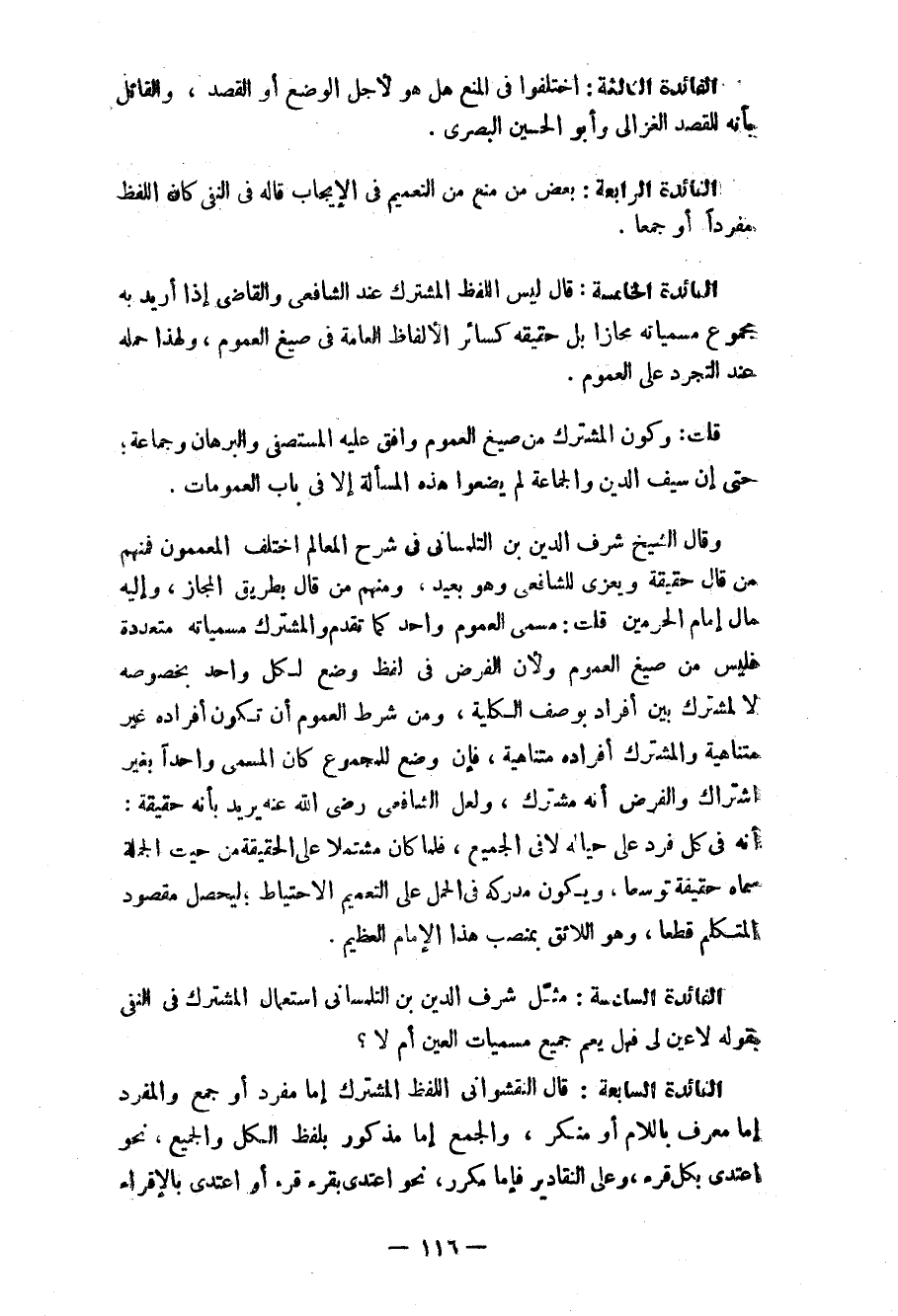 وقال الشيخ شرف الدين بن التلمساني في شرح المعالم اختلف المعممون فمنهم من قال حقيقة ويعزى للشافعي وهو بعيد، ومنهم من قال بطريق المجاز، وإليه مال إمام الحرمين. قلت: مسمى العموم واحد كما تقدم والمشترك مسمياته متعددة فليس من صيغ العموم ولأن الفرض في لفظ وضع لكل واحد بخصوصه لا لمشترك بين أفراد بوصف الكلية، ومن شرط العموم أن تكون أفراده غير متناهية والمشترك أفراده متناهية، فإن وضع للمجموع كان المسمى واحداً بغير اشتراك والفرض أنه مشترك، ولعل الشافعي رضي الله عنه يريد بأنه حقيقة: أنه في كل فرد على حياله لا في الجميع، فلما كان مشتملاً على الحقيقة من حيث الجملة سماه حقيقة وسعاً، ويكون مدركه في الحمل على التعميم الاحتياط؛ ليحصل مقصود المتكلم قطعاً، وهو اللائق بمنصب هذا الإمام العظيم.