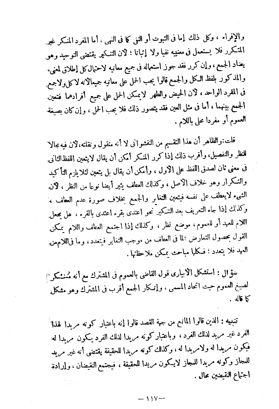 سؤال: استشكل الإبياري قول القاضي بالعموم في المشترك مع أنه مُنْكِر لصيغ العموم حيث اتحاد المسمى، وإنكار الجمع أقرب في المشترك وهو مشكل كما قاله.