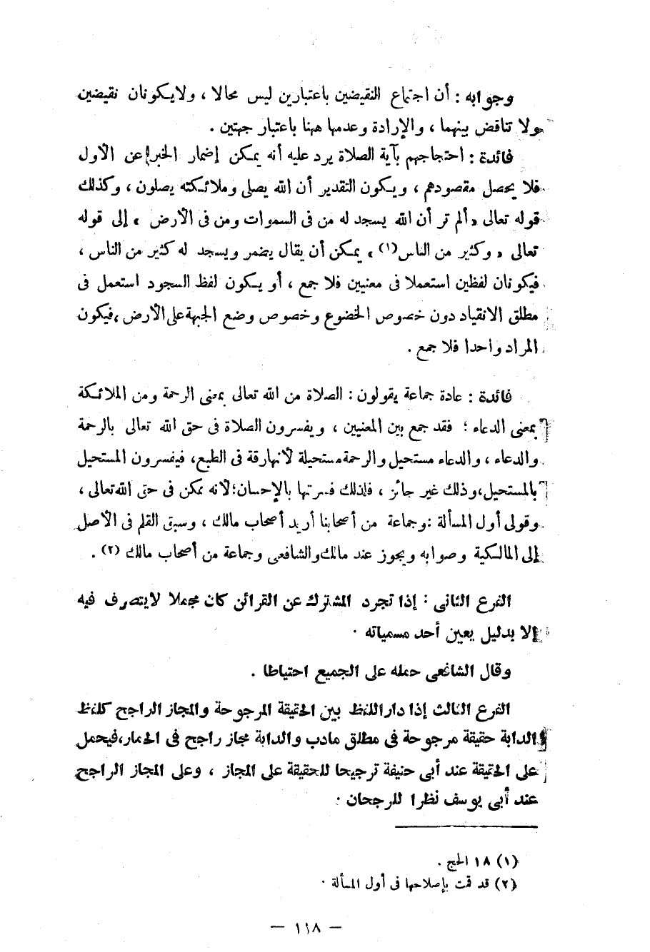 فائدة: احتجاجهم بآية الصلاة يرد عليه أنه يمكن إضمار الخبر عن الأول فلا يحصل مقصودهم، ويكون التقدير أن الله يصلي وملائكته يصلون، وكذلك قوله تعالى «ألم تر أن الله يسجد له من في السموات ومن في الأرض» إلى قوله تعالى «وكثير من الناس» (¬1) يمكن أن يقال يضمر ويسجد له كثير من الناس، فيكونان لفظين استعملا في معنيين فلا جمع، أو يكون لفظ السجود استعمل مطلق الانقياد دون خصوص الخضوع وخصوص وضع الجهة على الأرض، فيكون المراد واحداً فلا جمع.