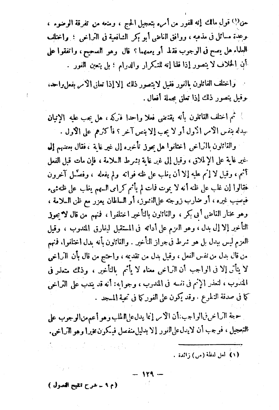 والقائلون بالتراخي اختلفوا هل يجوز تأخيره إلى غير غاية، فقال بعضهم إلى غير غاية على الإطلاق، وقيل إلى غير غاية بشرط السلامة، فإن مات قبل الفعل أثم، وقيل لا إثم عليه إلا أن يغلب على ظنه فواته ولم يفعله، وفصَّل آخرون فقالوا إ، غلب على ظنه أنه لا يموت فمات لم يأثم كرامي السهم يغلب على ظنه السلامة، وهو مختار القاضي أبي بكر، والقائلون بالتأخير اختلفوا، فمنهم من قال لا يجوز التأخير إلا إلى بدل، وهو العزم على أدائه في المستقبل ليفارق المندوب، وقيل العزم ليس ببدل بل هو شرط في جواز التأخير. والقائلون بأنه بدل اختلفوا، فمنهم من قال بدل من نفس الفعل، وقيل بدل من تقديمه، واحتج من قال بأن التراخي لا يتأتى إلا في الواجب أن التراخي معناه لا يأثم بالتأخير، وذلك متعذر في المندوب، لتعذر الإثم في نفسه في المندوب، وجوابه: أنه قد يندب على التراخي كما في صدقة التطور، وقد يكون على الفور كما في تحية المسجد.