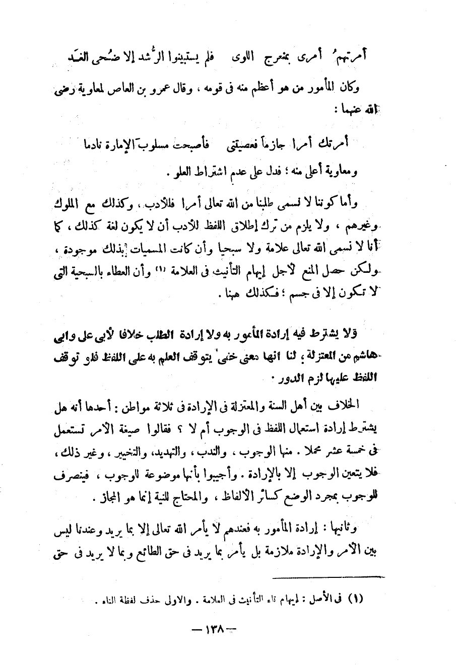 الخلاف بين أهل السنة والمعتزلة في الإرادة ثلاثة مواطن: أحدها أنه هل يشترط إرادة استعمال اللفظ في الوجوب أم لا؟ فقالوا صيغة الأمر تستعمل في خمسة عشر محملاً. منها الوجوب، والندب، والتهديد، والتخيير، وغير ذلك، فلا يتعين الوجوب إلا بالإرادة. وأجيبوا بأنها موضوعة للوجوب، فينصرف للوجوب بمجرد الوضع كسائر الألفاظ، والمحتاج للنية إنما هو المجاز.