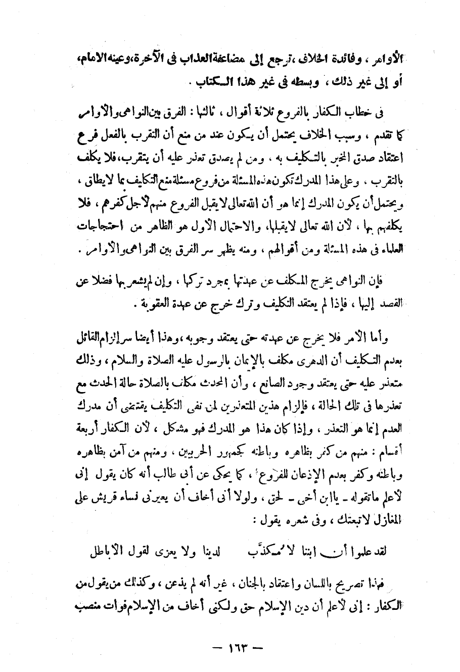 وأما الأمر فلا يخرج عن عهدته حتى يعتقد وجوبه، وهذا أيضاً سر إلزام القائل بعدم التكليف أن الدهري مكلف بالإيمان بالرسول عليه الصلاة والسلام، وذلك متعذر عليه حتى يعتقد وجود الصانع، وأن المحدث مكلف بالصلاة حالة الحدث مع تعذرها في تلك الحالة، فإلزام هذين المتعذرين لمن نفى التكليف يقتضي أن مدرك العدم إنما هو التعذر، وإذا كان هذا هو المدرك فهو مشكل، لأن الكفار أربعة اسم: منهم من كفر بظاهره وباطنه كجمهور الحربيين، ومنهم من آمن بظاهره وباطنه وكفر بعدم الإذعان للفروع، كما يحكى عن أبي طالب أنه كان يقول إني لأعلم ما تقوله - يا ابن أخي - لحق، ولولا أني أخاف أن يعيرني نساء قريش على المغازل لاتبعتك، وفي شعره يقول: