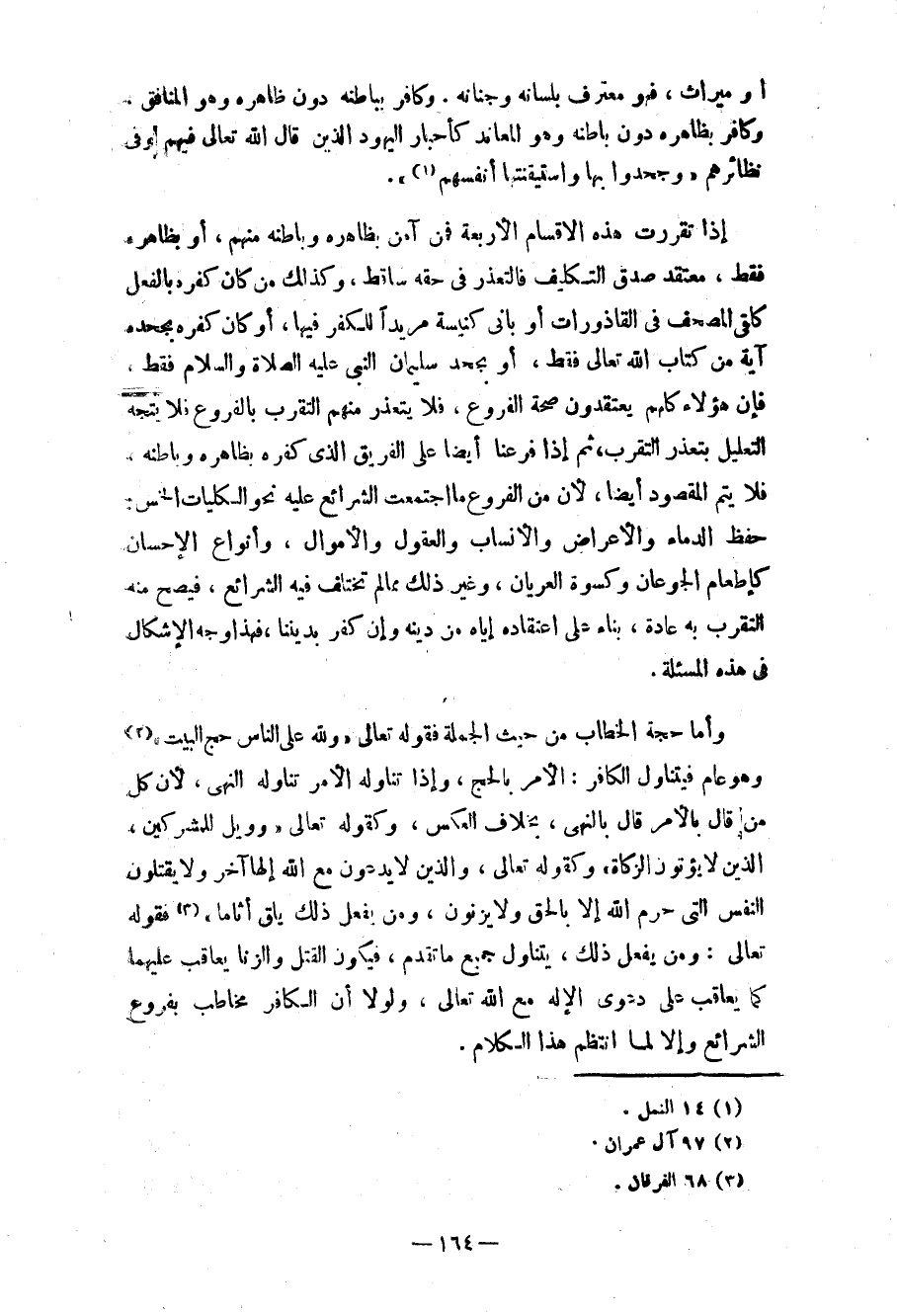 وأما حجة الخطاب من حيث الجملة فقوله تعالى «ولله على الناس حج البيت» (¬2) وهو عام فيتناول الكافر: الأمر بالحج، وإذا تناوله الأمر تناوله النهي، لأن كل من قال بالأمر قال بالنهي، بخلاف العكس، وكقوله تعالى «وويل للمشركين، الذين لا يؤتون الزكاة» وكقوله تعالى «والذين لا يدعون مع الله إلهاً آخر ولا يقتلون النفس التي حرم الله إلا بالحق ولا يزنون، ومن يفعل ذلك يلق أثاما» (¬3) فقوله تعالى: ومن يفعل ذلك، يتناول جميع ما تقدم، فيكون القتل والزنا يعاقب عليهما كما يعاقب على دعوى الإله مع الله تعالى، ولولا الكافر مخاطب بفروع الشرائع وإلا لما انتظم هذا الكلام.