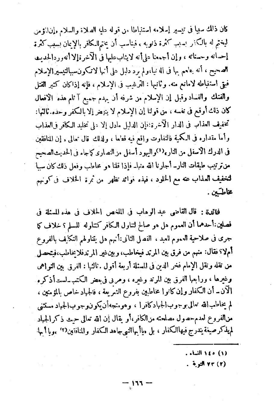 متجه أن يكون وجوب الجهاد مستثنى من الفروع لعدم حصول مصلحته من الكفار، أو يقال إن الله تعالى حيث ذكر الجهاد لم يذكر صيغة يندرج فيها الكفار، بل «يا أيها النبي جاهد الكفار والمنافقين» (¬2) ويا أيها