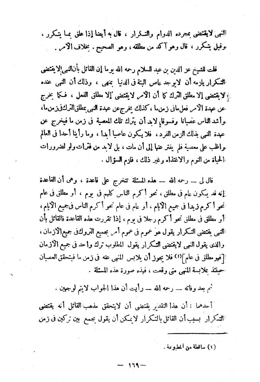 قلت للشيخ عز الدين بن عبد السلام رحمه الله يوماً إن القائل بأن النهي لا يقتضي التكرار يلزمه أن لا يوجد عاص البتة في الدنيا بمنهي، وذلك أن النهي عنده لا يقتضي إلا مطلق الترك كما أن الأمر لا يقتضي إلا مطلق الفعل، فكما يخرج عن عهدة الأمر فعل ما في زمن ما، كذلك يخرج عن عهدة النهي بمطلق الترك في زمن ما، وأشد الناس عصياناً وفسوقاً لا بد أن يترك تلك المعصية في زمن ما فيخرج عن عهدة النهي بذلك الزمن الفرد، فلا يكون عاصياً أبداً، وما رأينا أحداً في العالم واظب على معصية فلم يفتر عنها إلى أن مات، بل لا بد من فترات ولو لضرورات الحياة من النوم والاغتداء وغير ذلك، فلزم السؤال.