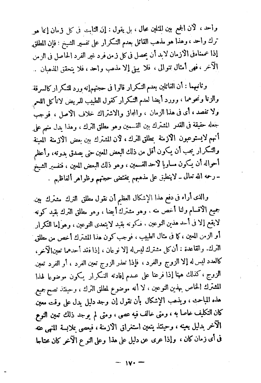 واحد، لأن الجمع بين المثلين محال، بل يقول: إن الثابت في كل زمان إنما هو ترك واحد، وهذا هو مذهب القائل بعدم التكرار على تفسير الشيخ؛ فإن المطلق إذا عممناه في الأزمان لا بد أن يحصل في كل زمن من فرد غير الفرد الحاصل في الزمن الآخر، فهي أمثال تتوالى، فلا يبقى إلا مذهب واحد، فلا يتحقق المذهبان.