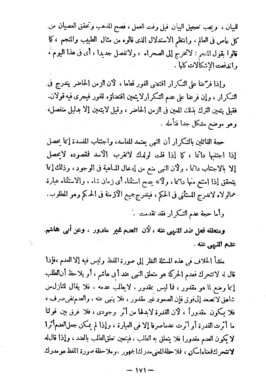 حجة القائلين بالتكرار أن النهي يعتمد المفاسد، واجتناب المفسدة إنّما يحصل إذا اجتنبها دائماً، كما إذا قلت لولدك لا تقرب الأسد فمقصوده لا يحصل إلاّ بالاجتناب دائماً، ولأن النهي منع من إدخال الماهية في الوجود، وذلك إنّما يتحقق إذا امتنع منها دائماً، ولأنه يصح استثناء أي زمن شاء، والاستثناء عبارة عما لولاه لاندرج المستثنى في الحكم، فيندرج جميع الأزمنة في الحكم وهو المطلوب.